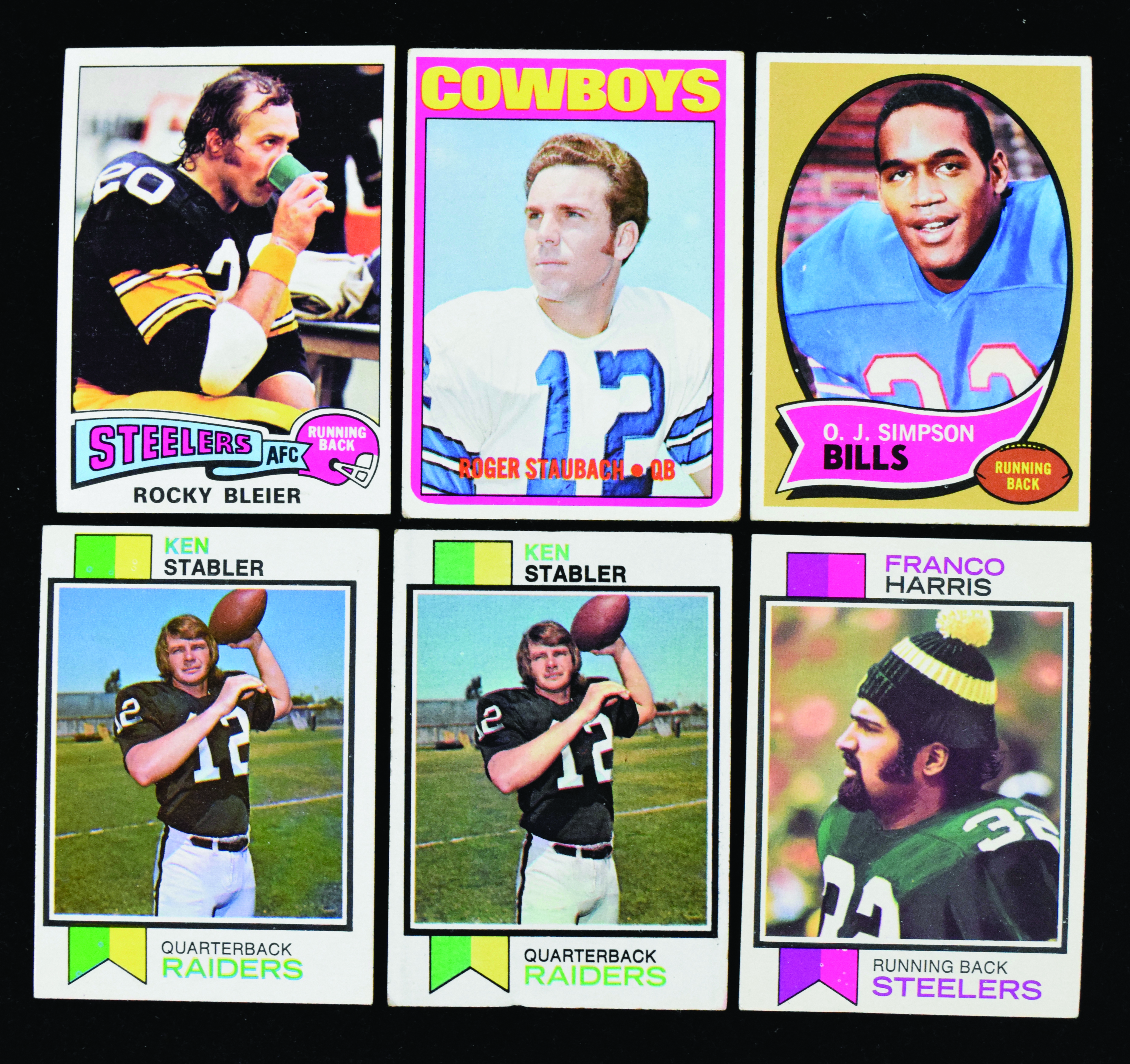 Lot of (8) 1970-1975 Topps FB RCs, with Simpson, Staubach and Stabler (VG-EX/MT). High-value assortment of 1970s football rookies includes 1970 Topps #90 O.J. Simpson (VG/EX+); 1972 Topps #200 Roger Staubach (VG); (2) 1973 Topps #89 Franco Harris (VG & VG/EX); (2) 1973 Topps #487 Ken Stabler (VG & VG/EX); 1973 Topps #115 Jack Ham (VG/EX) and 1975 Topps #39 Rocky Bleier (EX/MT). Range: VG-EX/MT.