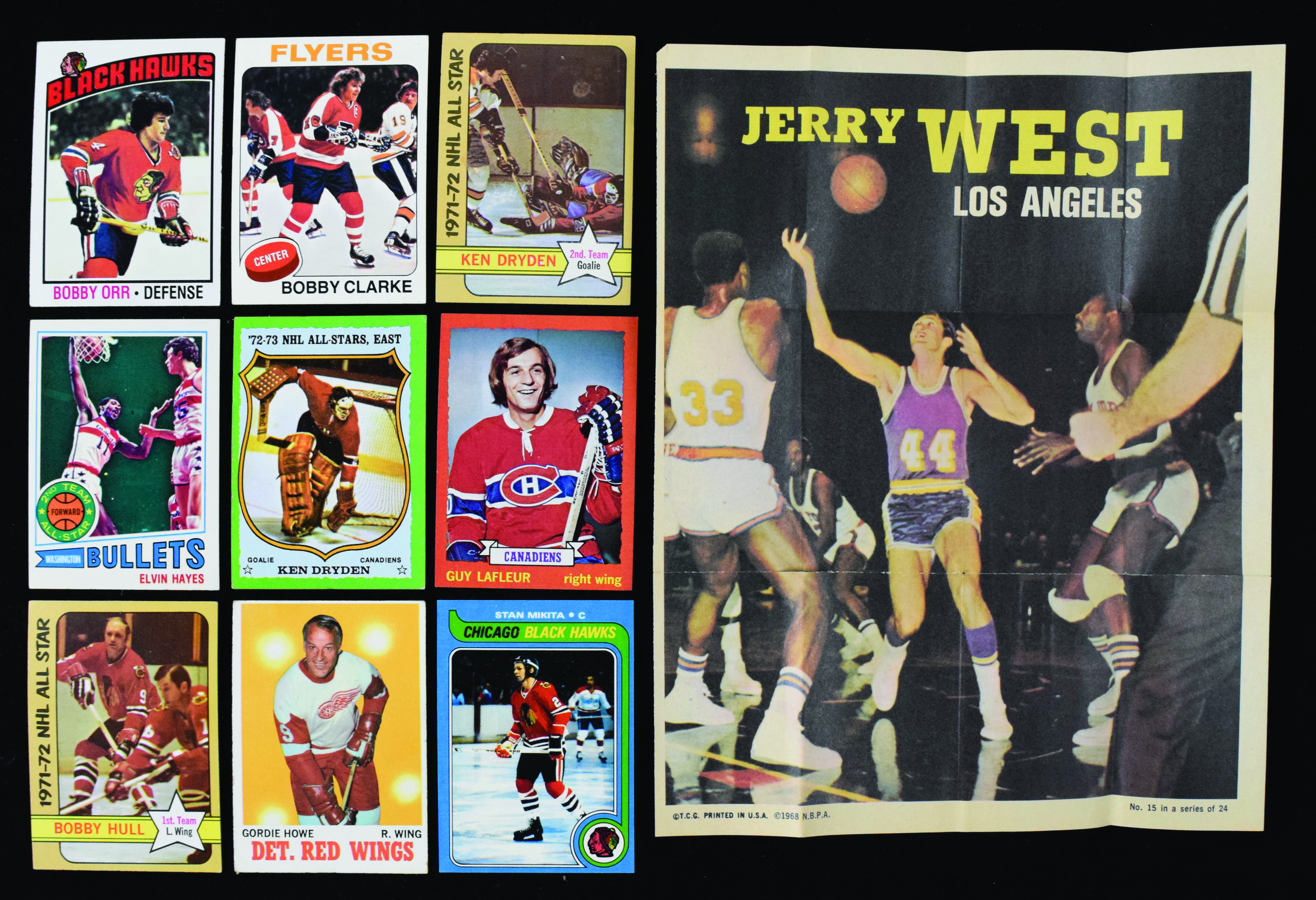 Description:Lot of approx. (700) 1970-1979 Topps hockey and basketball cards with HOFers (PR-NM). Lot is primarily mixed years Topps hockey cards from 1970-1979 (with many 1975-76) and approx. (50) 1970s Topps basketball cards. Includes commons, minor stars and numerous Hall of Famers throughout. Most appear VG-VG/EX with some better and some worse. Range: PR-NM.