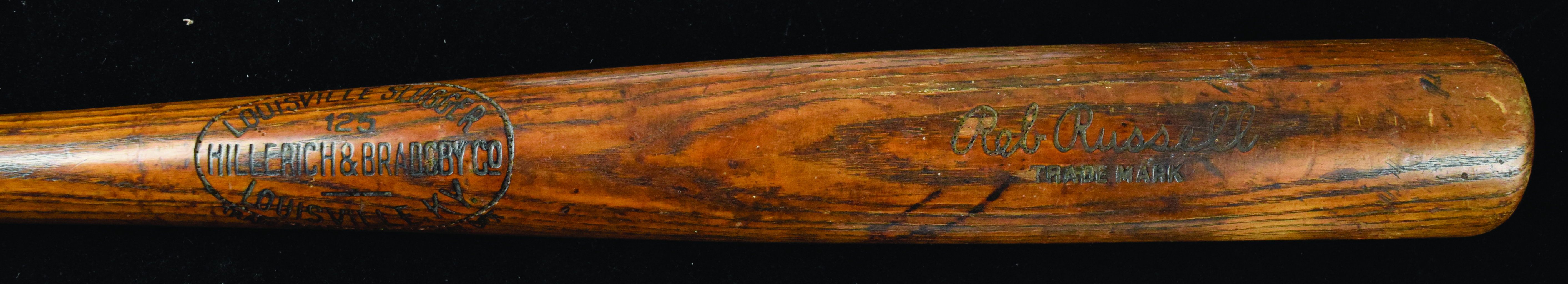 Description:Reb Russell professional model bat, c. 1917-21 (EX). Hillerich & Bradsby 125 model bat with Reb Russell facsimile signature impressed in the barrel measures 34 1/2" long and weighs 40.1 oz. Uncracked with light evident use, including grain swelling/separation on the reverse of the barrel , which has been repaired with five nails. Notably rare bat made for the former White Sox pitcher Russell, likely for his return to Major League Baseball as an outfielder with the Pittsburgh Pirates in 1922. Bat: EX (with note to repairs).
