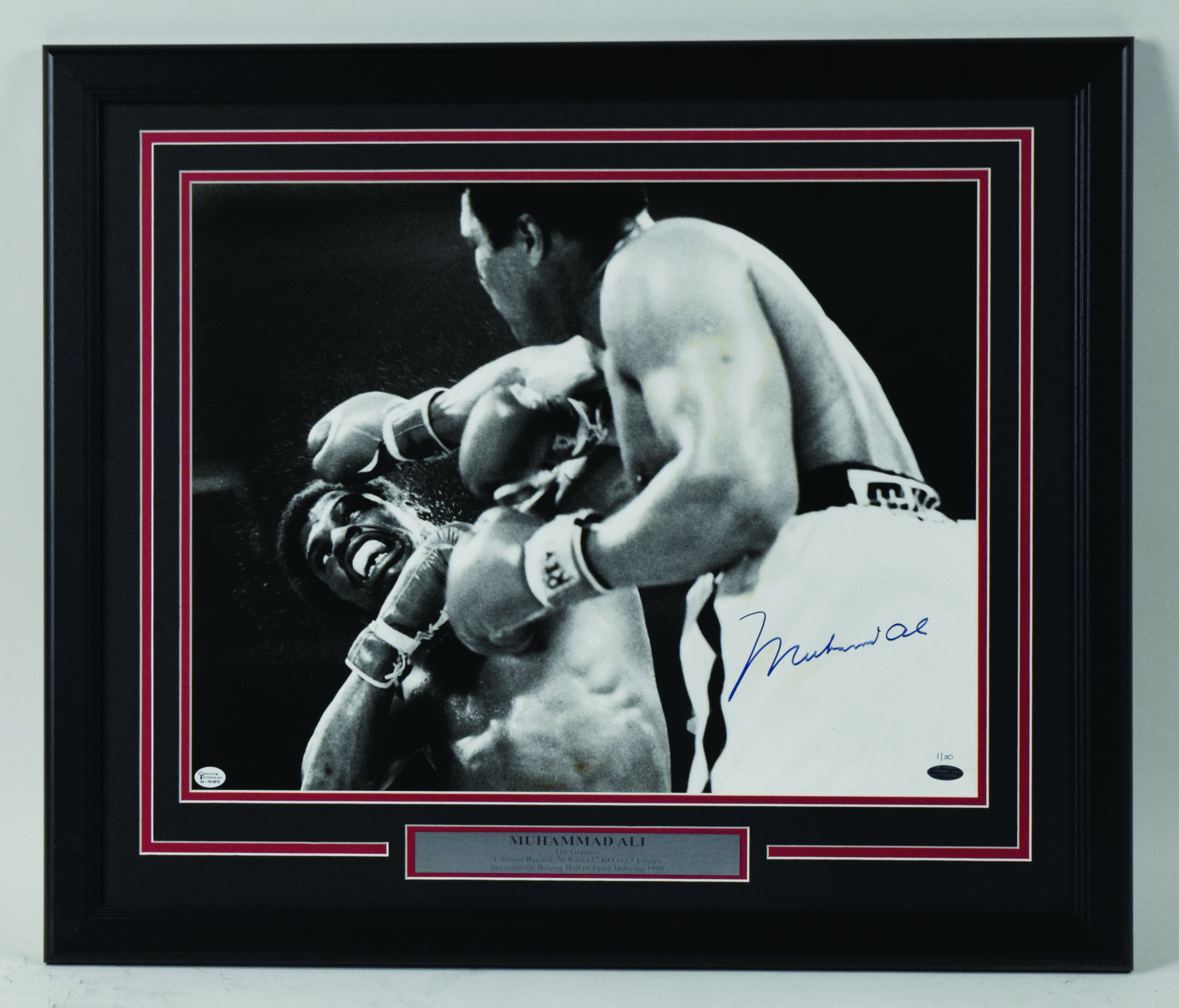 Description:Muhammad Ali autographed limited edition oversize framed photograph - Steiner (NM). Frame measures approx. 22"x26" (photo is 16"x20"). Ali signed the photo in blue marker. Signature rates 8/9 out of 10. Includes COA from Steiner (Online Authentics and Steiner authentication stickers are on the photo). The photo is #ed 1/50. Due to framing, complete condition is unknown: NM appearance ($500-$750)