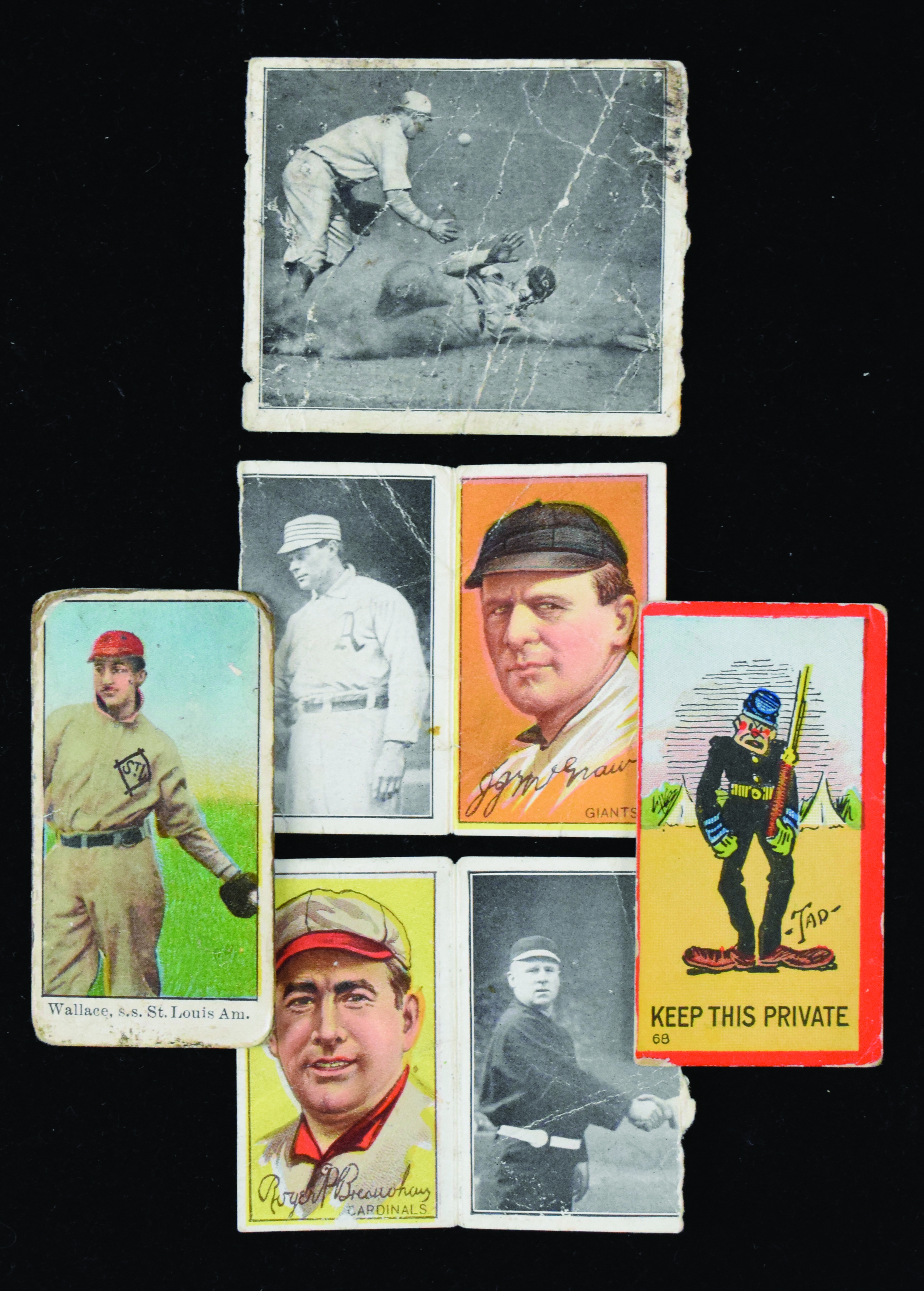Description:Lot of (6) prewar sports and nonsports issues, including T88 and American Caramel (see description). Also includes (1) 1906-11 T88 Type 4 Sweet Caporal Mutt & Jeff Series #68 Keep This Private; (2) 1909 E90-1 American Caramel cards glued back-to-back to one another: Bill Bailey and Bobby Wallace, and (4) separated pieces of 1912 Hassan Triple Folders, with John McGraw, Roger Bresnahan, Chas. O'Leary and Too Late for DeWitt center panel. Range: PR-FR.