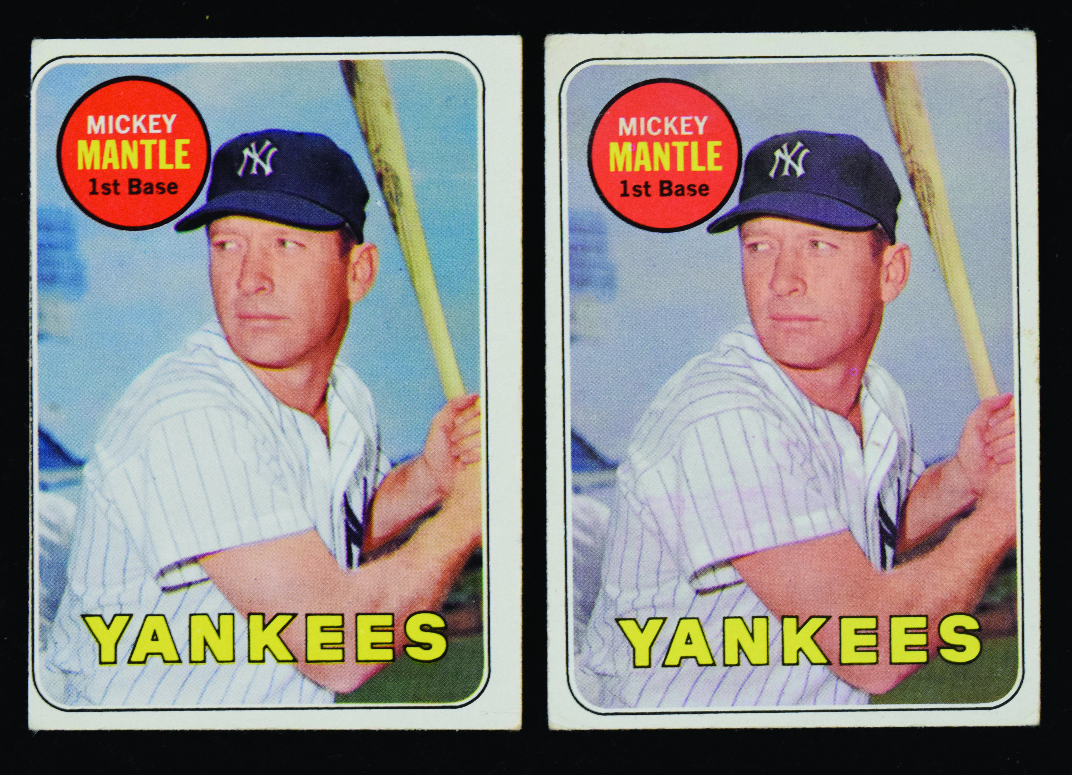 Description:Lot of (2) 1969 Topps #500 Mickey Mantle cards (Miscut - VG). Both cards have the last name in yellow, with one copy grading VG and one miscut (otherwise VG/EX appearance). Backs of both cards are relatively clean: Miscut - VG.