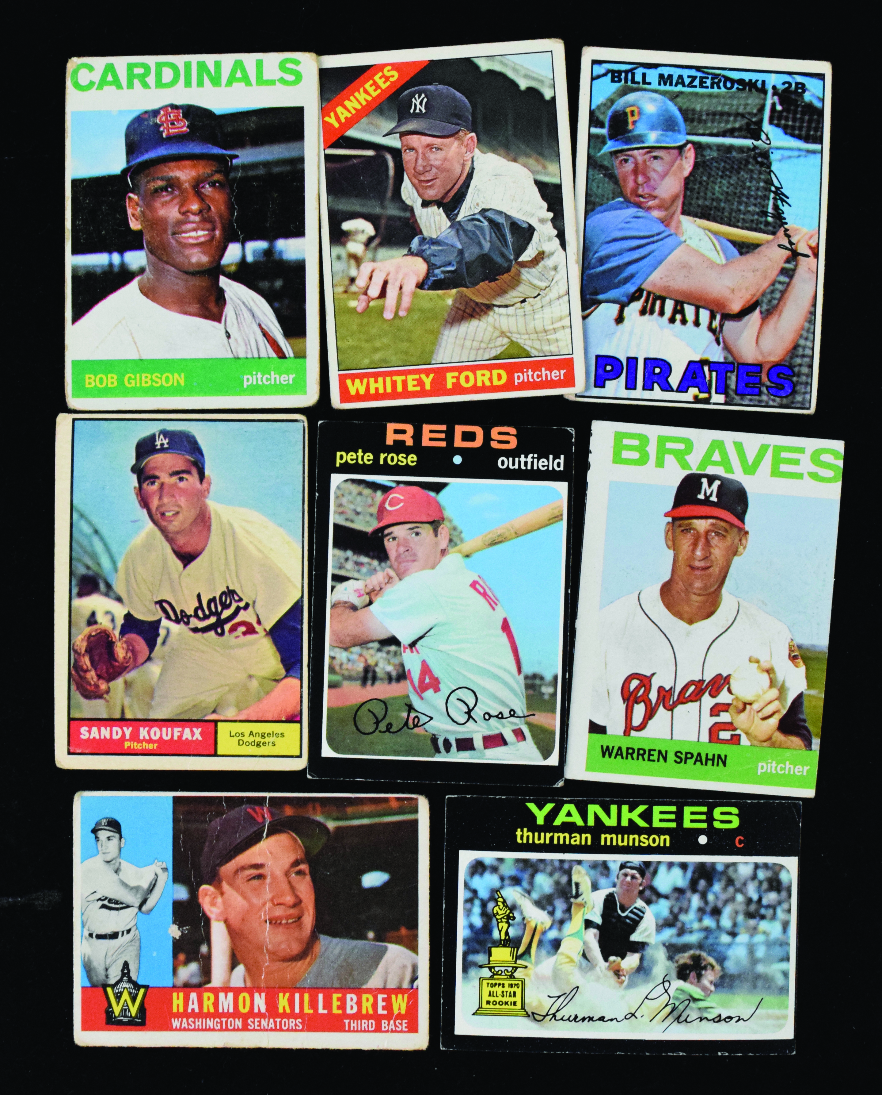 Description:Lot of (84) 1960-1971 mostly Topps cards with stars, including Rose, Munson and Koufax (PR-VG/EX). Mixed years lot spans 1960 through 1971, with most cards Topps and a few Kellogg's. Highlights include 1960 Topps #210 Harmon Killebrew; 1961 Topps #344 Sandy Koufax; 1964 Topps #s 460 Bob Gibson, 400 Warren Spahn and 538 Minnie Minoso; 1966 Topps #s 217 Willie Mays LL and 160 Whitey Ford; 1967 Topps #s 55 Don Drysdale, 228 Gil Hodges, 445 Don Sutton, 510 Bill Mazeroski, and 242 Aaron/Clemente LL; 1971 Topps #s 5 Thurman Munson, 230 Willie Stargell, 26 Bert Blyleven RC and 100 Pete Rose, and more. Most appear VG. Range: PR-VG/EX.