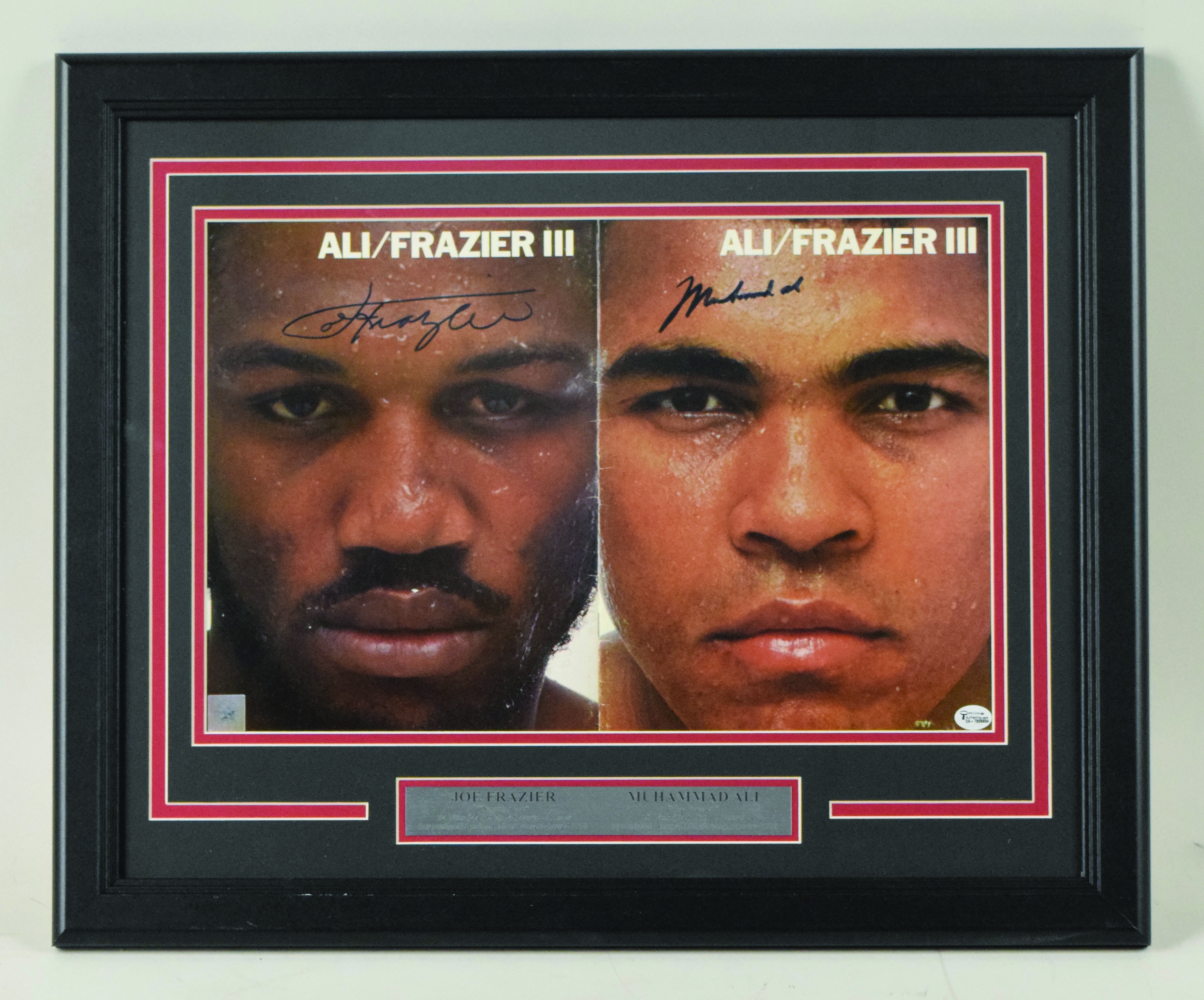 Description:Muhammad Ali & Joe Frazier dual-signed oversize framed publication photograph - JSA (EX/MT). Frame measures approx. 18.5"x22" and contains a fold-open publication photo signed by both Frazier and Ali in blue marker. Signatures rate 9 to 10 out of 10. Includes full LOA from JSA. Due to framing, complete condition is unknown: EX/MT appearance ($500-$750)