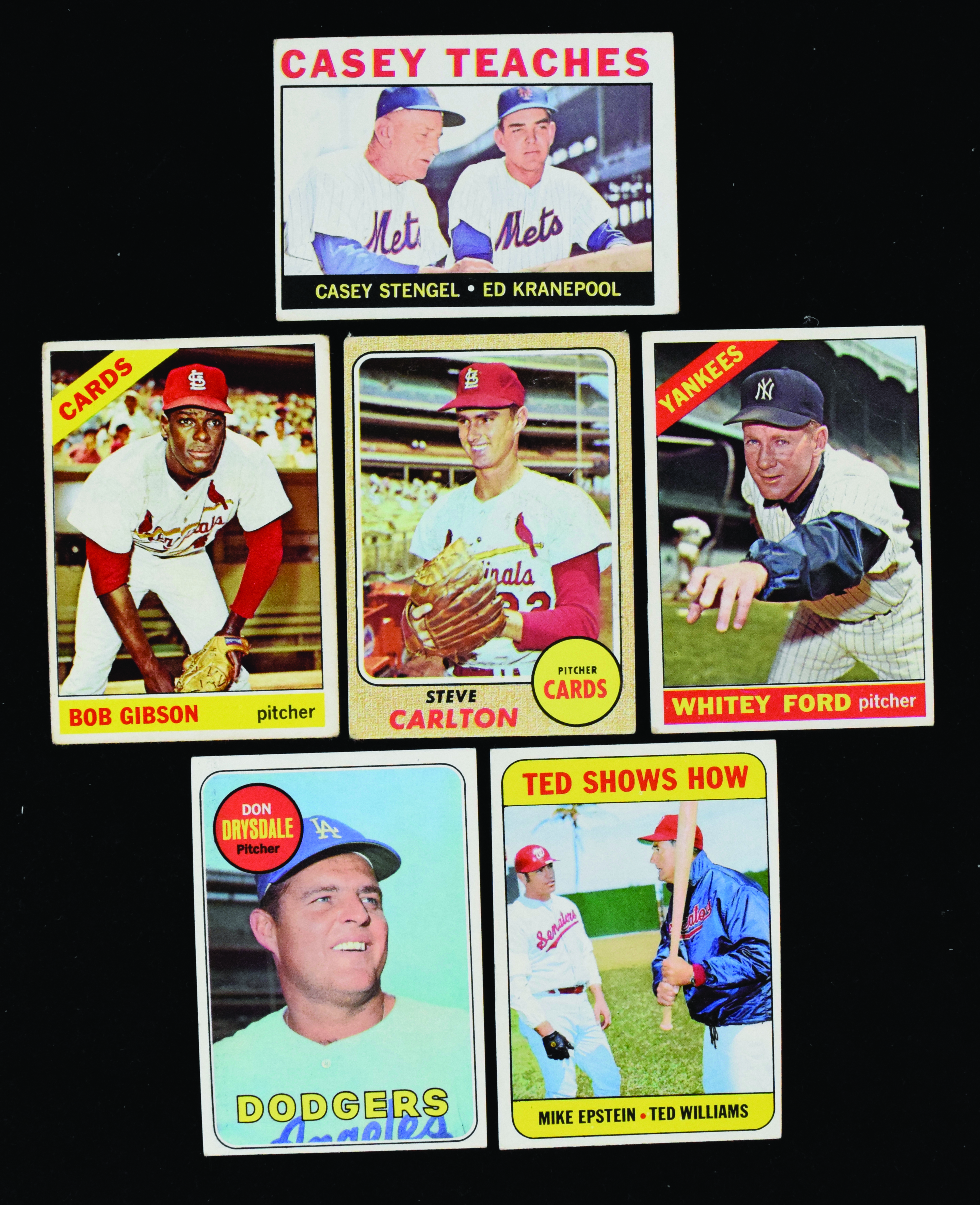Description:Lot of approx. (360) mostly 1966-1969 Topps cards with HOFers (PR-EX). Mixed years lot (with duplication) includes primarily 1966, 1968 and 1969 Topps cards, with some earlier and some later. Lot includes stars and Hall of Famers, such as 1961 Topps # 88 Richie Ashburn; 1964 Topps #393 Casey Stengel Teaches; 1966 Topps #s 200 Eddie Mathews, (2) 195 Joe Morgan, 160 Whitey Ford, 99 Willie Stargell/Donn Clendenon and 320 Bob Gibson; 1967 Topps #s 450 Richie Allen and 100 Frank Robinson; 1968 Topps #s 408 Steve Carlton, 144 Joe Morgan and 200 Orlando Cepeda; 1969 Topps #s 400 Don Drysdale, 539 Ted Williams Shows How 35 Joe Morgan, 412 Mickey Mantle checklist (unmarked) 564 Gil Hodges and more. Most cards, housed in pages, appear VG-VG/EX with some better and some worse, including some with tape or writing. Range: PR-EX.