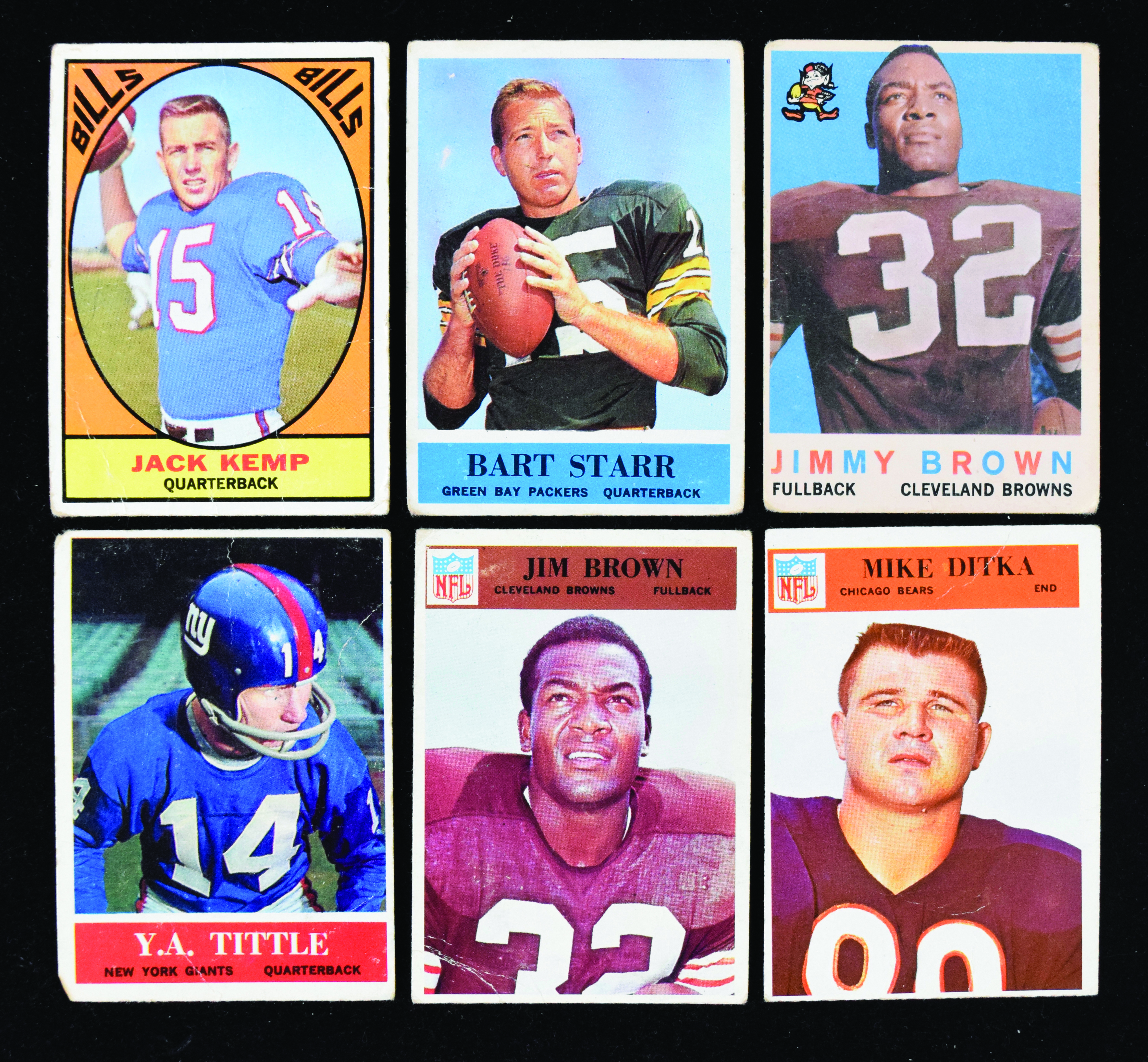 Description:Low-grade lot of (20) 1950s-60s football cards, including Mike Ditka, (2) Jim Brown (PR-FR). Low-grade lot of football cards spans 1959 through 1967 Topps and Philadelphia. Highlights incude 1959 Topps #10 Jim Brown; 1964 Philadelphia #s 79 Bart Starr and 124 Y.A. Tittle (writing on reverse); 1966 Philadelphia #s 41 Jim Brown, 21 Lenny Moore and 32 Mike Ditka and 1967 Topps #s 97 Don Maynard and (2) 24 Jack Kemp. Range: PR-FR.