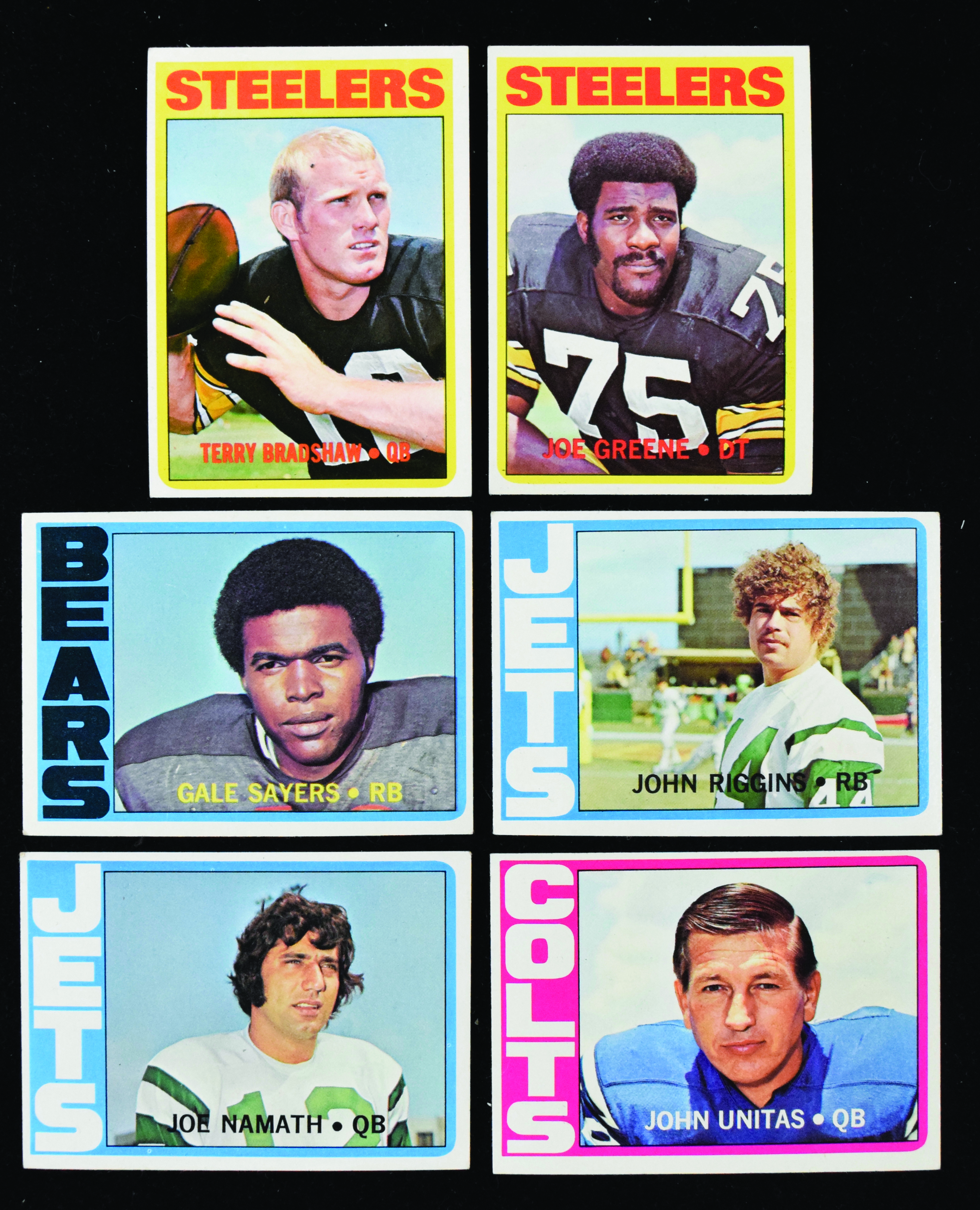 Description:Lot of approx. (275) 1972 Topps football cards with HOFers and RCs, many clean (PR-EX/MT). Mostly clean low-number lot (with duplication) is highlighted by numbers stars Hall of Famers and rookie cards, including #s 150 Terry Bradshaw, 65 Jim Plunkett RC, 100 Joe Namath, 165 Johnny Unitas, 160 O.J. Simpson, 55 Archie Manning RC 110 Gale Sayers, (2) 170 Dick Butkus, (2) 230 Joe Greene, (2) 106 Lyle Alzadao, (2) 93 Ted Hendricks RC, (2) 42 Lem Barney RC, (2) 120 Terry Bradshaw IA, (2) 101 L.C. Greenwood RC, 13 John Riggins RC, 145 Bob Lilly, 244 Charlie Joiner RC, 235 George Blanda and more. Most appear EX with some better and some worse. Range: PR-EX/MT.
