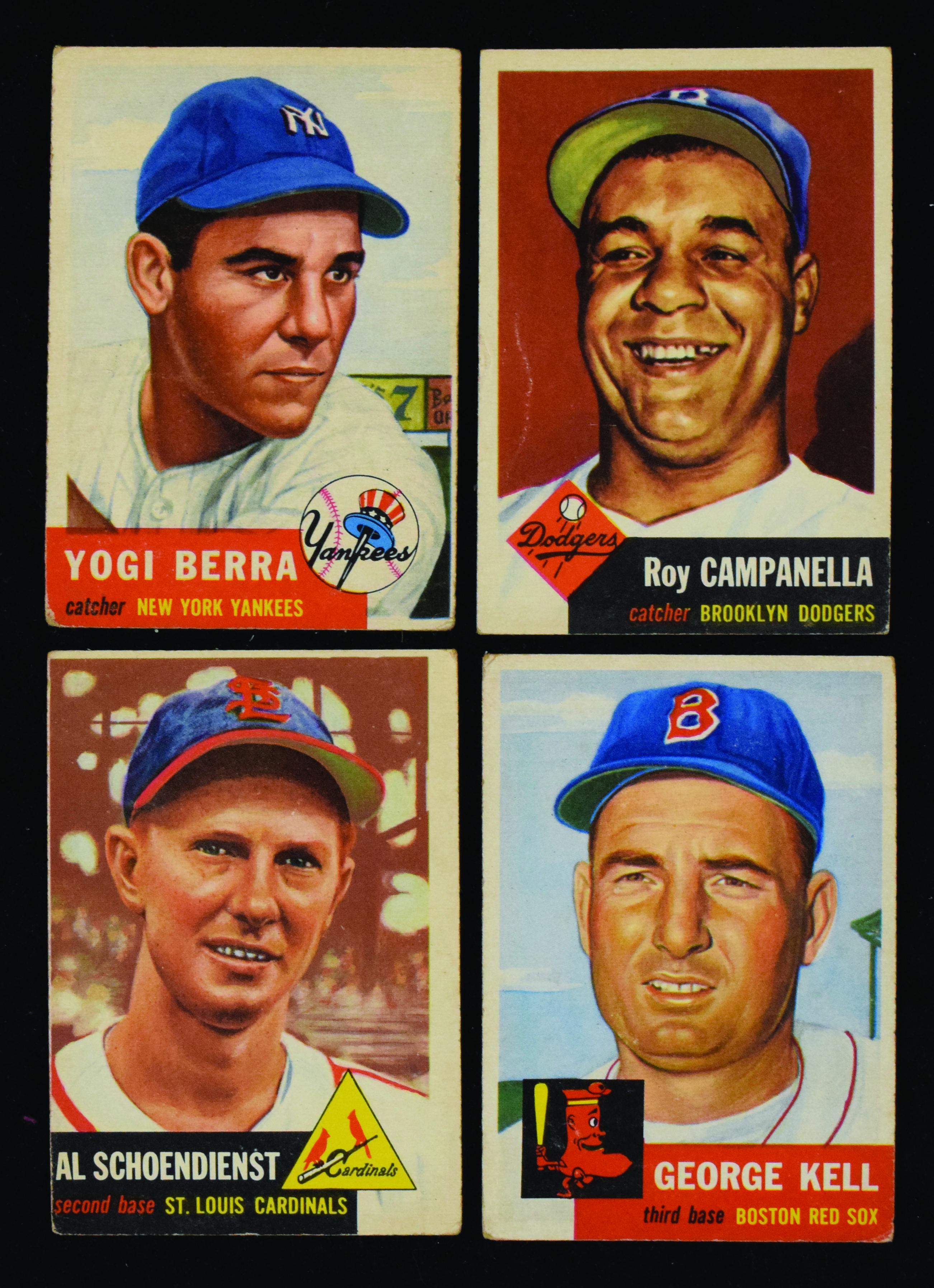 Description:Lot of (4) 1953 Topps HOFers, including Campanella and Berra (FR-VG). Assortment of Hall of Famers from the 1953 Topps set includes #78 Red Schoendienst (VG; miscut), 27 Roy Campanella (FR), 104 Yogi Berra (GD) and 138 George Kell (VG). Range: FR-VG.
