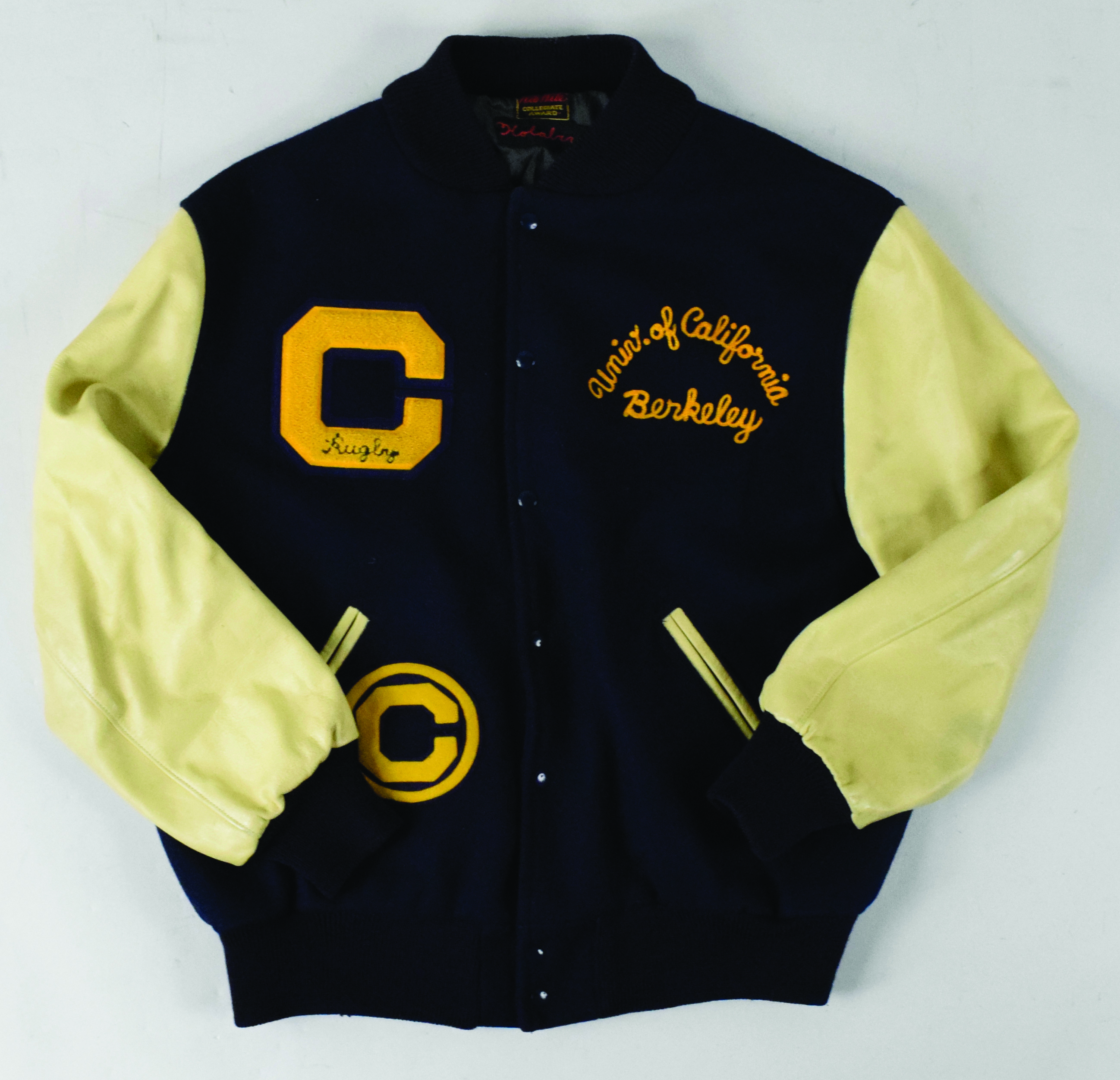 Description:Very nice University of California-Berkley Varsity rugby captain's jacket, c. 1930s (EX/MT). Classic, heavy-duty size 48 letterman's style blue wool jacket with cream leather sleeves has Wil White Collegiate Award and "Holabird" tags stitched in the collar, attributing the jacket to Cal Bears' rugby captain Tim Holabird. Gold "University of California Berkley" and "C - Rugby" are stitched on the front. Includes a certificate from the Cal Athletics Department certifying that "Timothy Holabird has won the right to wear a C - Rugby." Jacket has light wear overall: EX/MT.