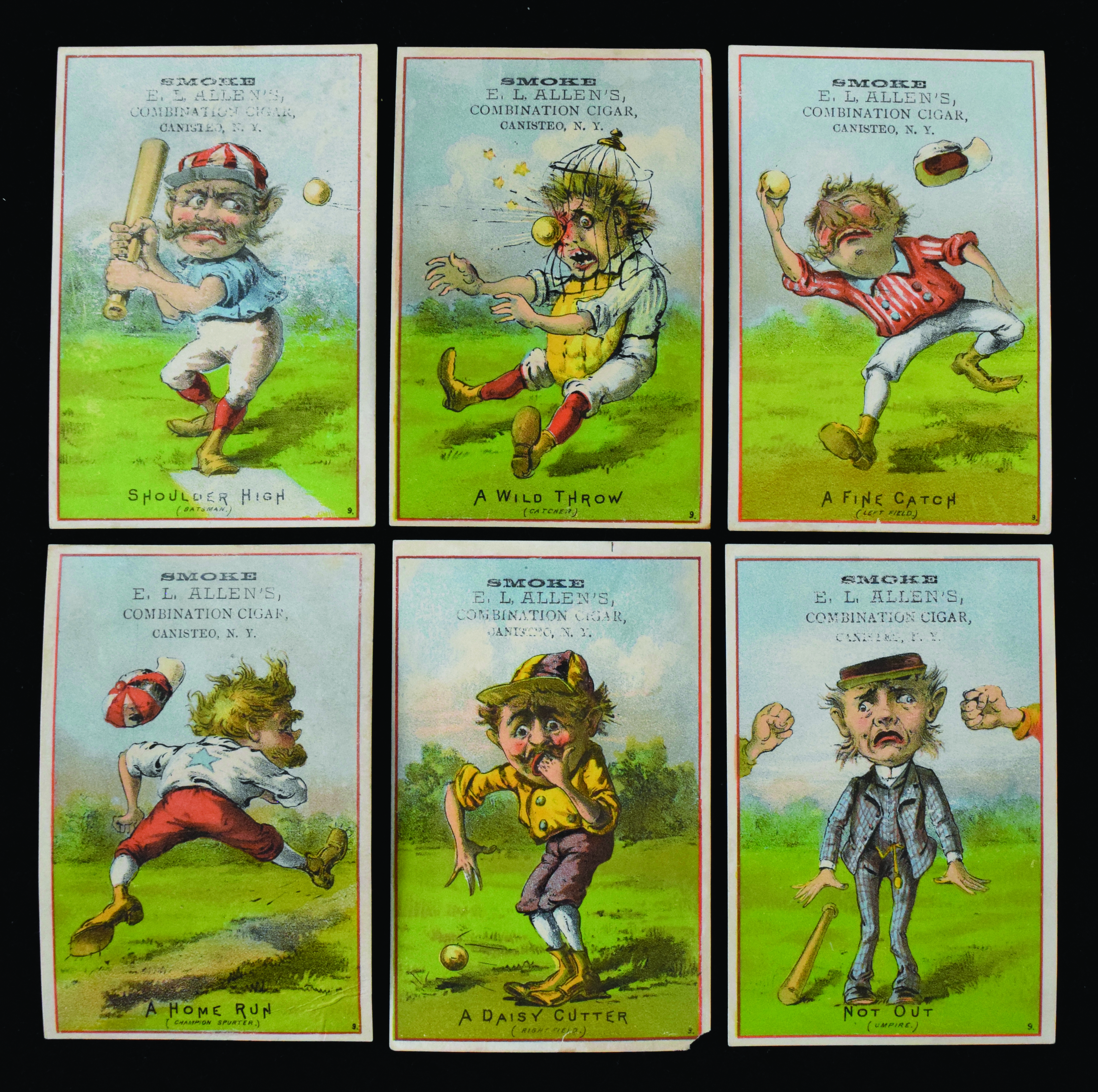 Description:Lot of (6) 1880s H804-14 baseball advertising comic trade cards (PR-VG/EX). Interesting grouping of H804-15 red border trade cards with humorous illustrations produced by Tobin Lithographs, each with E.L. Allen's Combination Cigar advertising at the top. Each is blank-backed. Includes "A Daisy Cutter," "Not Out," "A Fine Catch," "Shoulder High," "A Wild Throw" and "A Home Run." Range: PR-VG/EX.