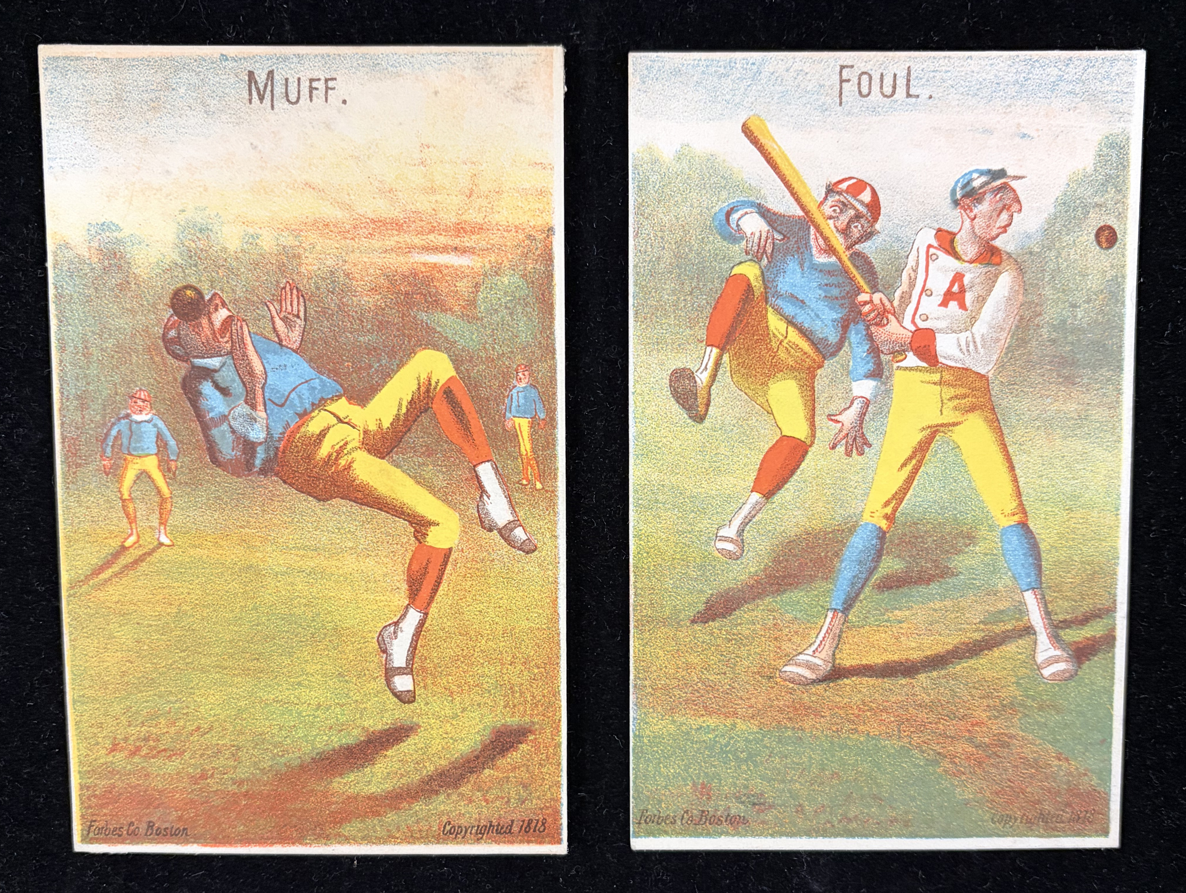 Description:Lot of (2) 1878 H804-6 Forbes Co. baseball comic trade cards (VG-VG/EX). Nice grouping of baseball comic trade cards issued by Forbes Co., with "Muff" (VG; light adhesive on reverse) and "Foul" (VG/EX; light paper abrasion on reverse). Both are blank-backed. Range: VG-VG/EX.
