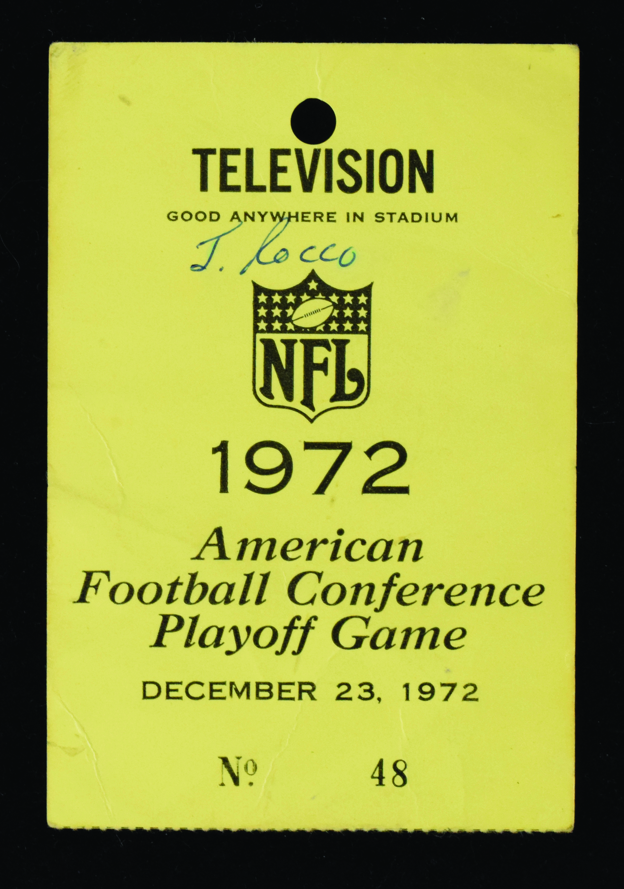 Description:12/23/1972 Immaculate Reception press pass (GD). Television pass good for anywhere in Three Rivers Stadium during the AFC Divisional Round playoff game in which the Pittsburgh Steelers defeated the Oakland Raiders by a score of 13-7 on the dramatic Immaculate Reception by Franco Harris. Scattered creases, and name written on the front: GD