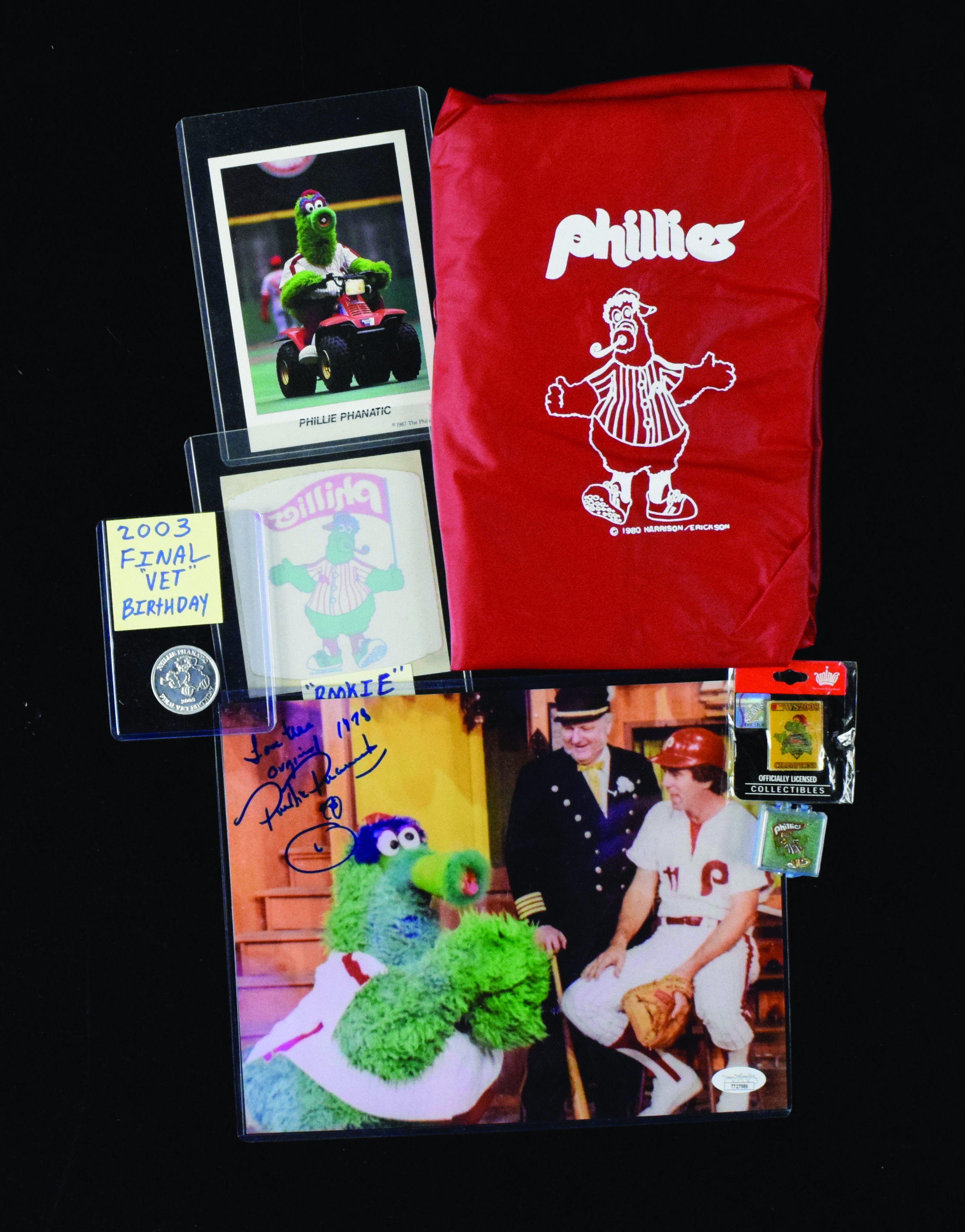 Description:Interesting lot of Phillie Phanatic memorabilia (NM-NM/MT). Includes 1978 Phanatic pin, 1978 Phanatic decal, 8"x10" photo signed by the original Phillie Phanatic (JSA), 1980 Phanatic poncho, Phanatic 1987 team issue photo card, Phanatic 2003 Final Vet Birthday medallion, and Phanatic 2008 World Series Champions pin: NM-NM/MT