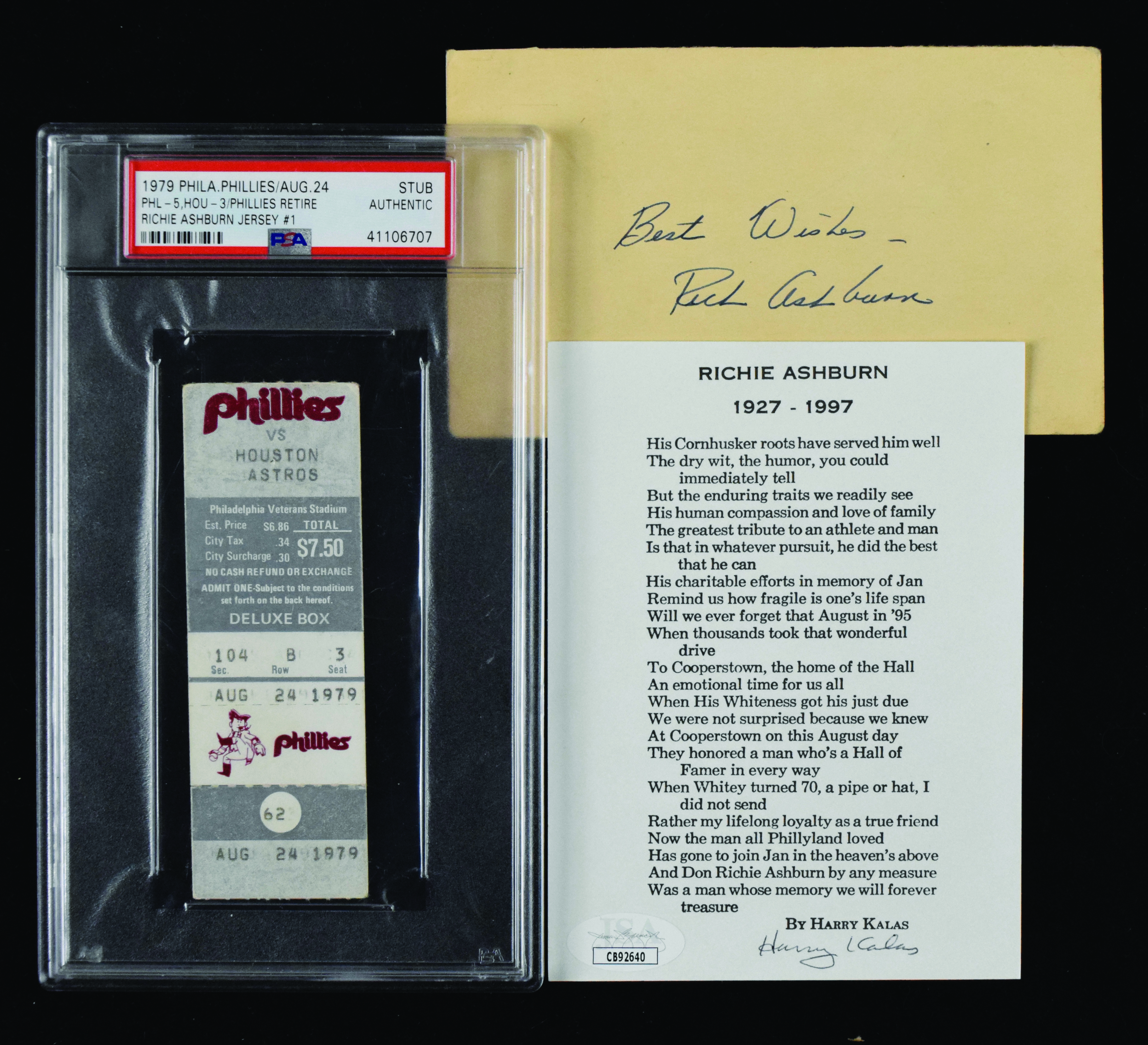 Description:Lot of Richie Ashburn and Harry Kalas memorabilia and autographs (VG-NM). Includes 1950 government postcard signed by Richie Ashburn (JSA), 8/24/1979 Houston Astros at Philadelphia Phillies ticket stub from Ashburn's jersey number retirement (VG - PSA Authentic), and 4"x5.25" Ashburn tribute card with Harry Kalas poem on the back signed by Kalas (JSA): VG-NM