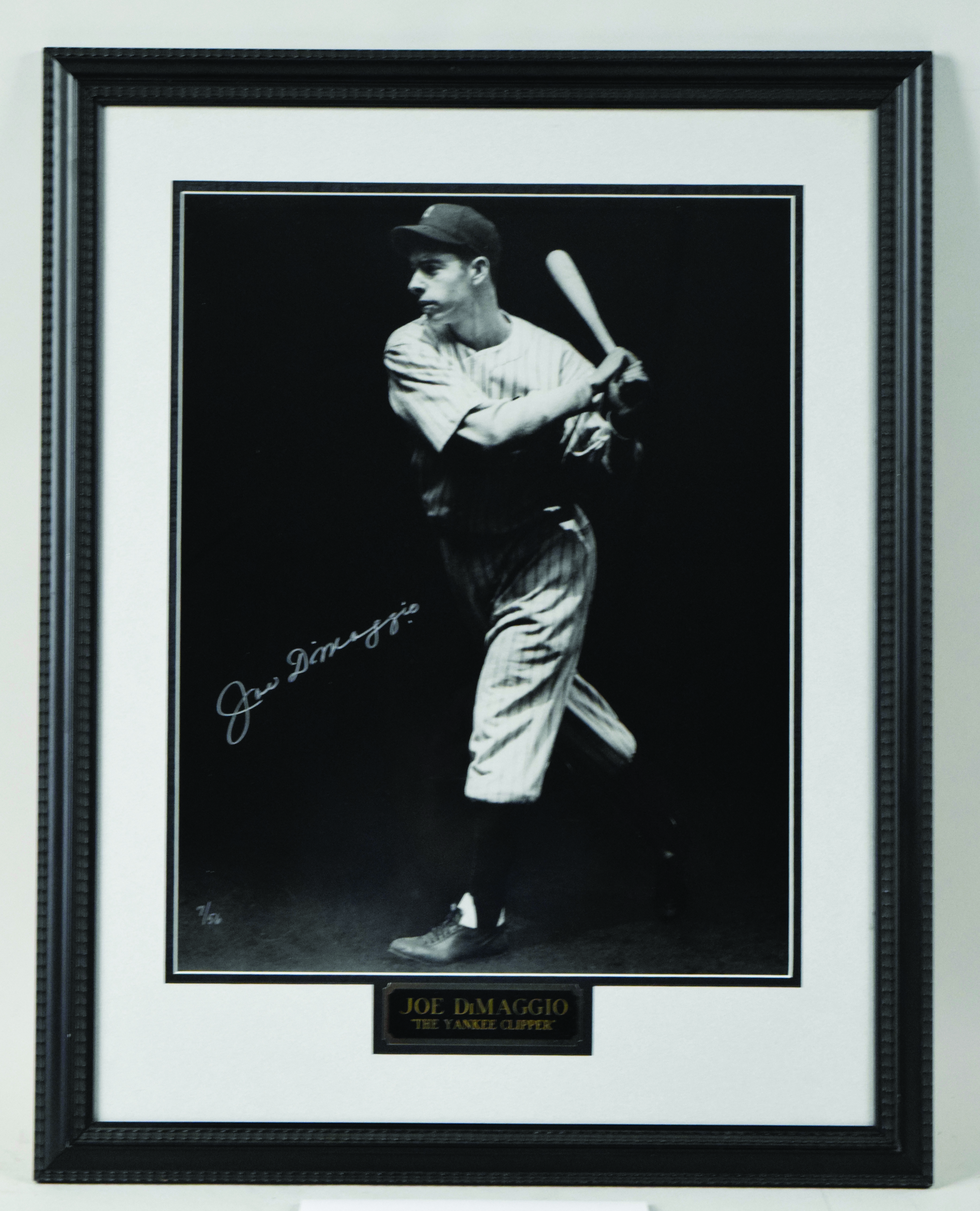 Description:Joe DiMaggio autographed limited edition oversize framed photograph (NM). Frame measures approx. 22.5"x28.5". DiMaggio signed the photo in silver marker. Signature rates 9/10 out of 10. The photo is #ed 7/56. Due to framing, complete condition is unknown: NM appearance ($300-$500)