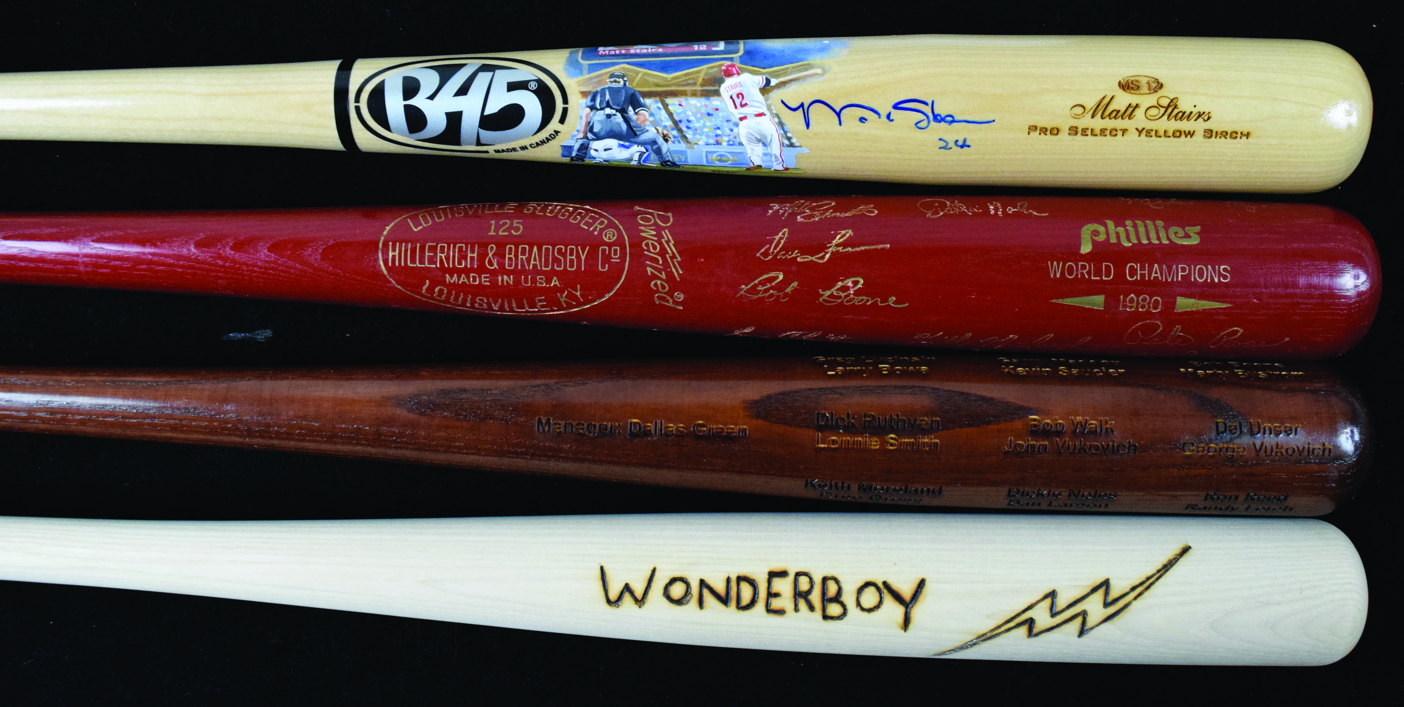 Description:Lot of (5) commemorative, signed, and souvenir baseball bats (EX-NM/MT). Includes 35" Louisville Slugger 1980 Philadelphia Phillies red World Champions bat (EX), 33.5" "Savoy Special" and "Wonderboy" replica bats from The Natural (NM-NM/MT), 34" B45 Pro Select Yellow Birch MS12 Matt Stairs model bat signed by Stairs and painting on the bat signed by artist Gregg Packer (NM unused), 34" Louisville Slugger modern Phillies 1980 World Champions bat (NM).