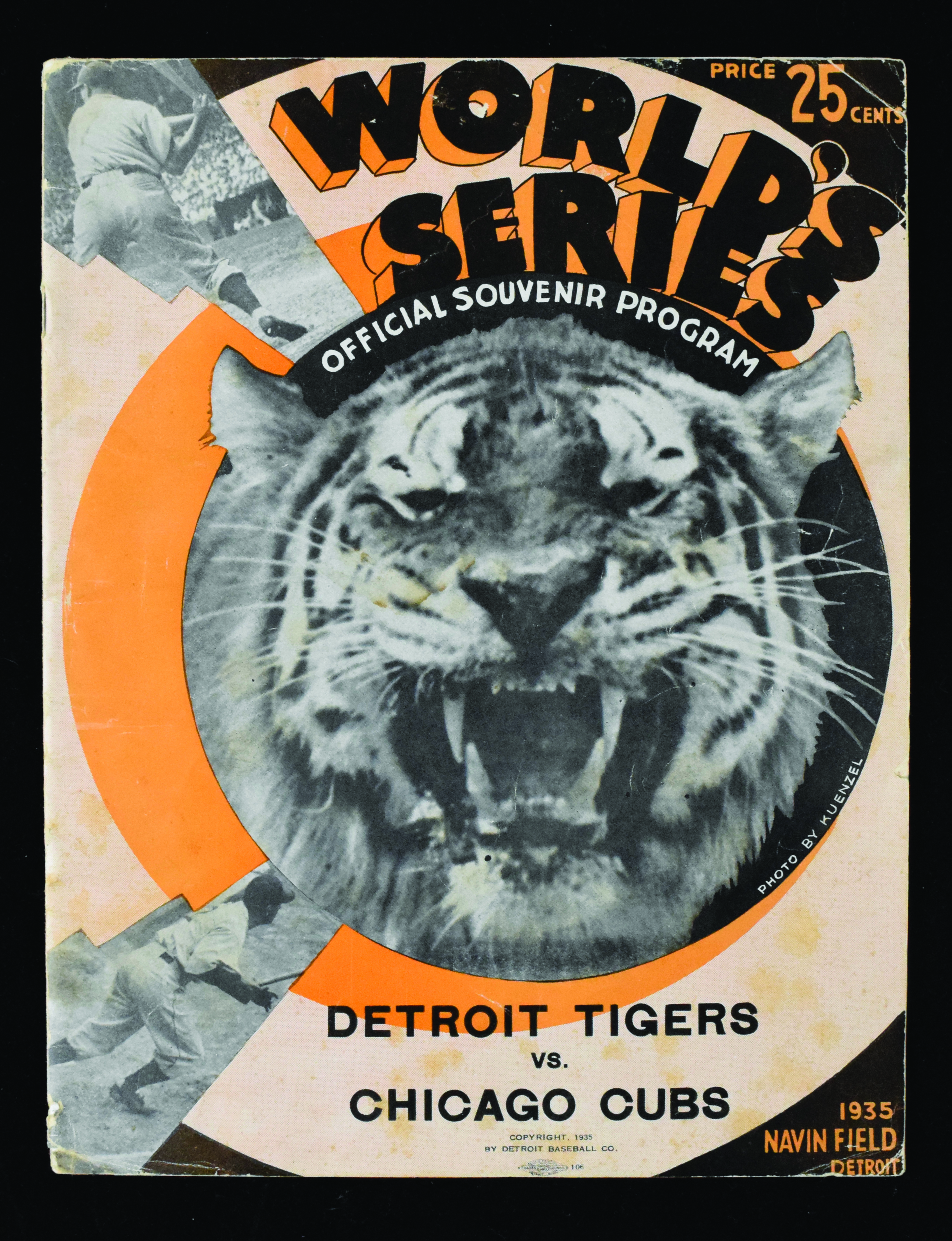 Description:1935 World Series program - at Detroit (VG). Navin Field program from game between the Chicago Cubs at Detroit Tigers. Unscored, with scattered cover stains and wear, but interior remains fairly clean: VG