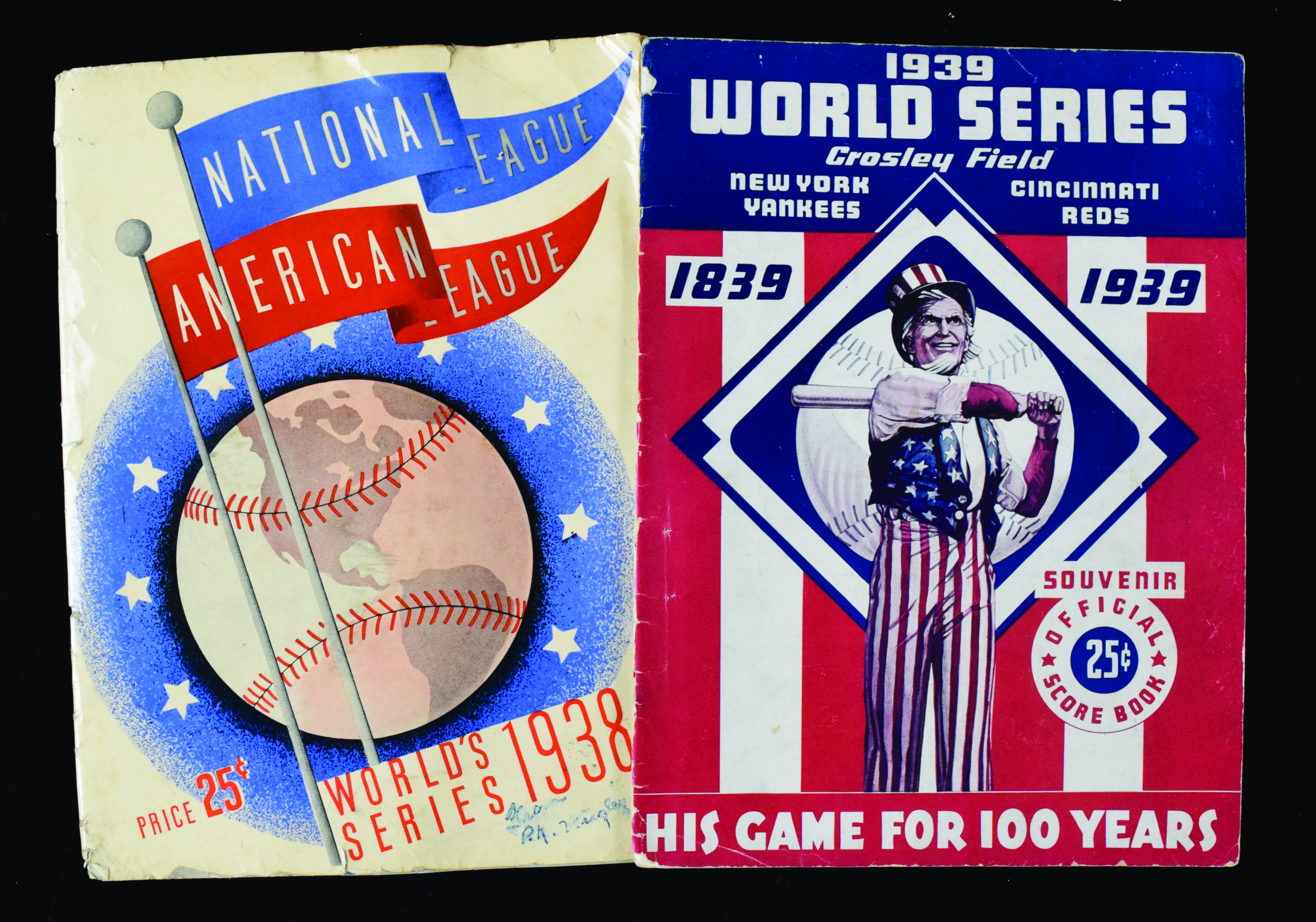 Description:1938 and 1939 World Series program with ticket stubs (FR/GD-VG). Includes program from game played at Wrigley Field (FR/GD unscored), and 1939 program with (2) Game 3 ticket stubs glued on the 1st page (G/VG-VG scored).