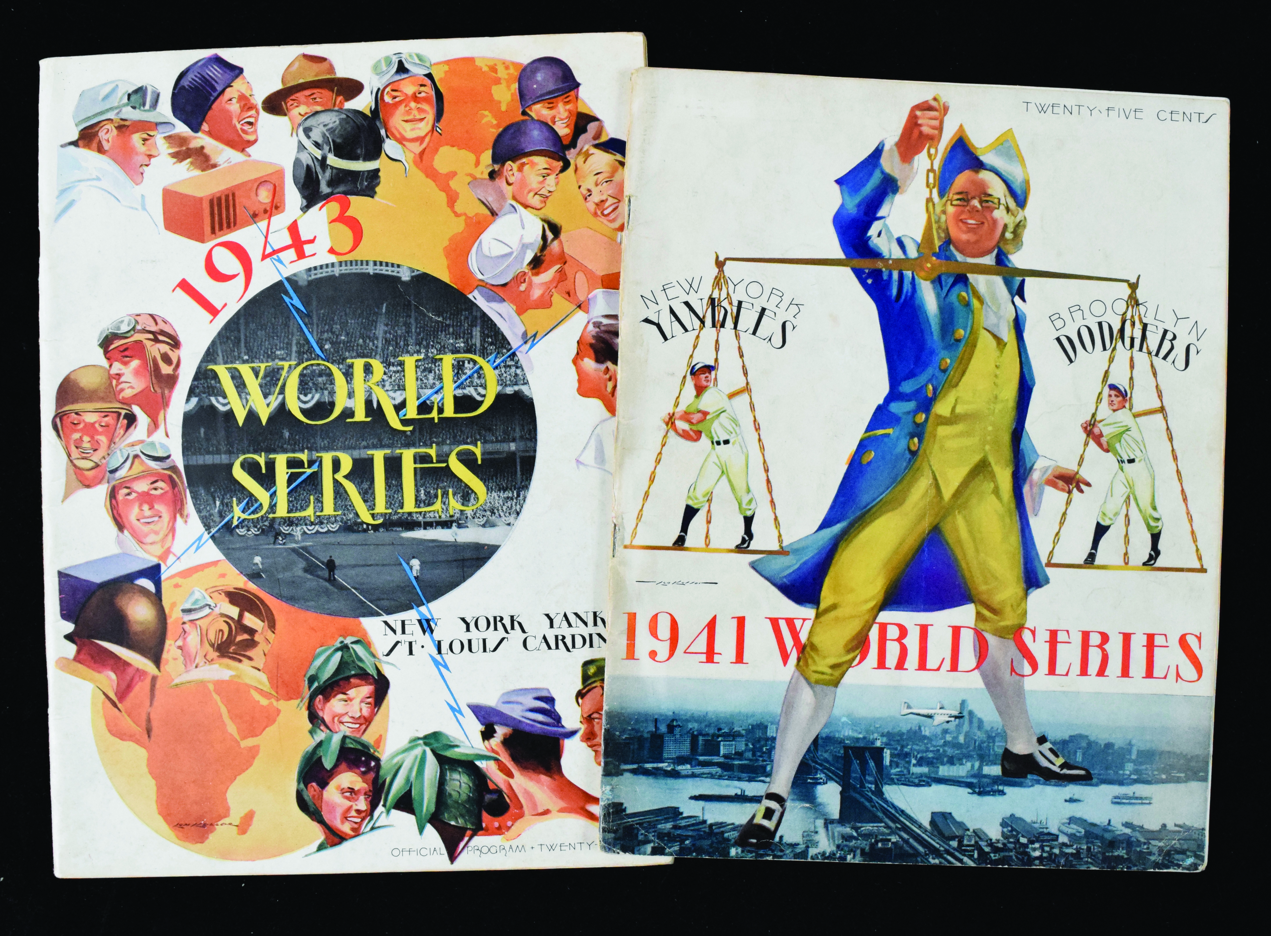 Description:1941 and 1943 World Series programs (VG-EX). Includes 1941 program from game played at Yankee Stadium (VG unscored), and 1943 program from game played at Yankee Stadium (EX unscored).