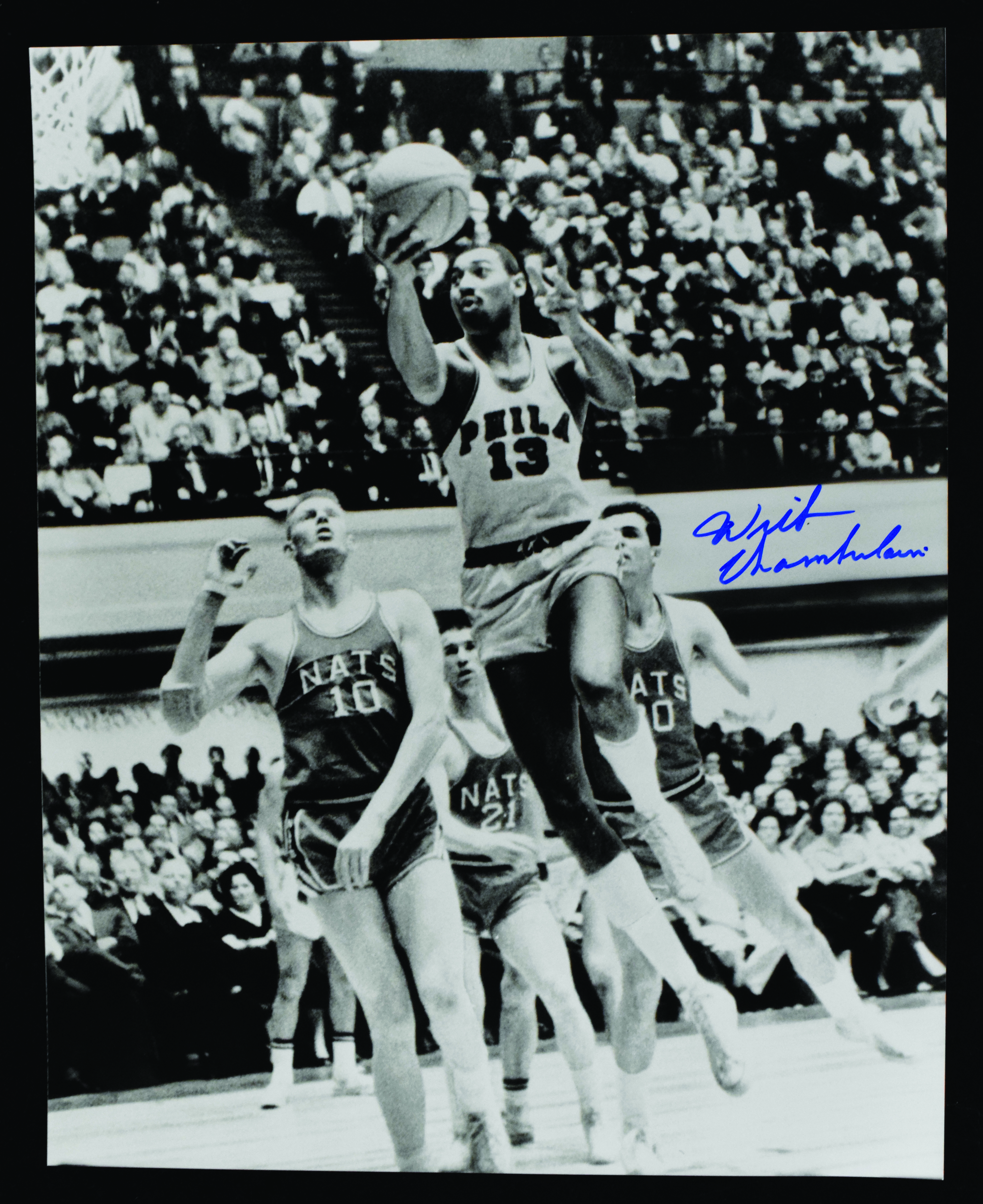 Description:Wilt Chamberlain autographed 16"x20" photograph (NM). Chamberlain signed the photo in blue marker. Signature rates 9/10 out of 10: NM ($400-$600)