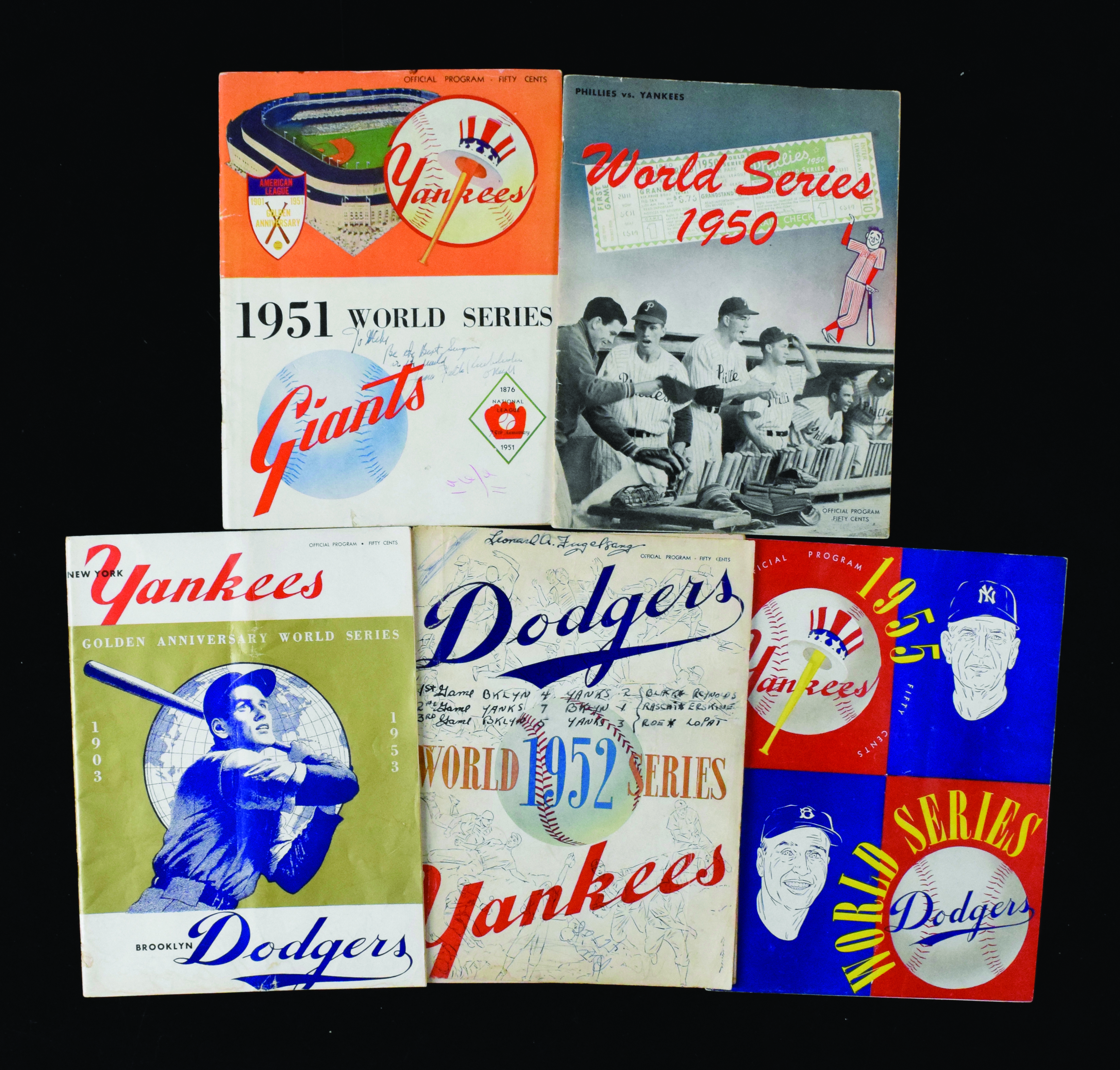 Description:Lot of (5) World Series programs from 1950-1955 (PR/FR-EX). Includes 1950 program scored from Game 1 played at Shibe Park (EX), 1951 program from game played at Yankee Stadium (VG unscored - writing on cover), 1952 progtram partially scored from Game 1 played at Ebbets Field (PR/FR detached front cover and missing back cover - writing on cover), 1953 program from game played at Yankee Stadium (VG unscored), and 1955 program scored from Game 2 played at Yankee Stadium (VG/EX-EX).