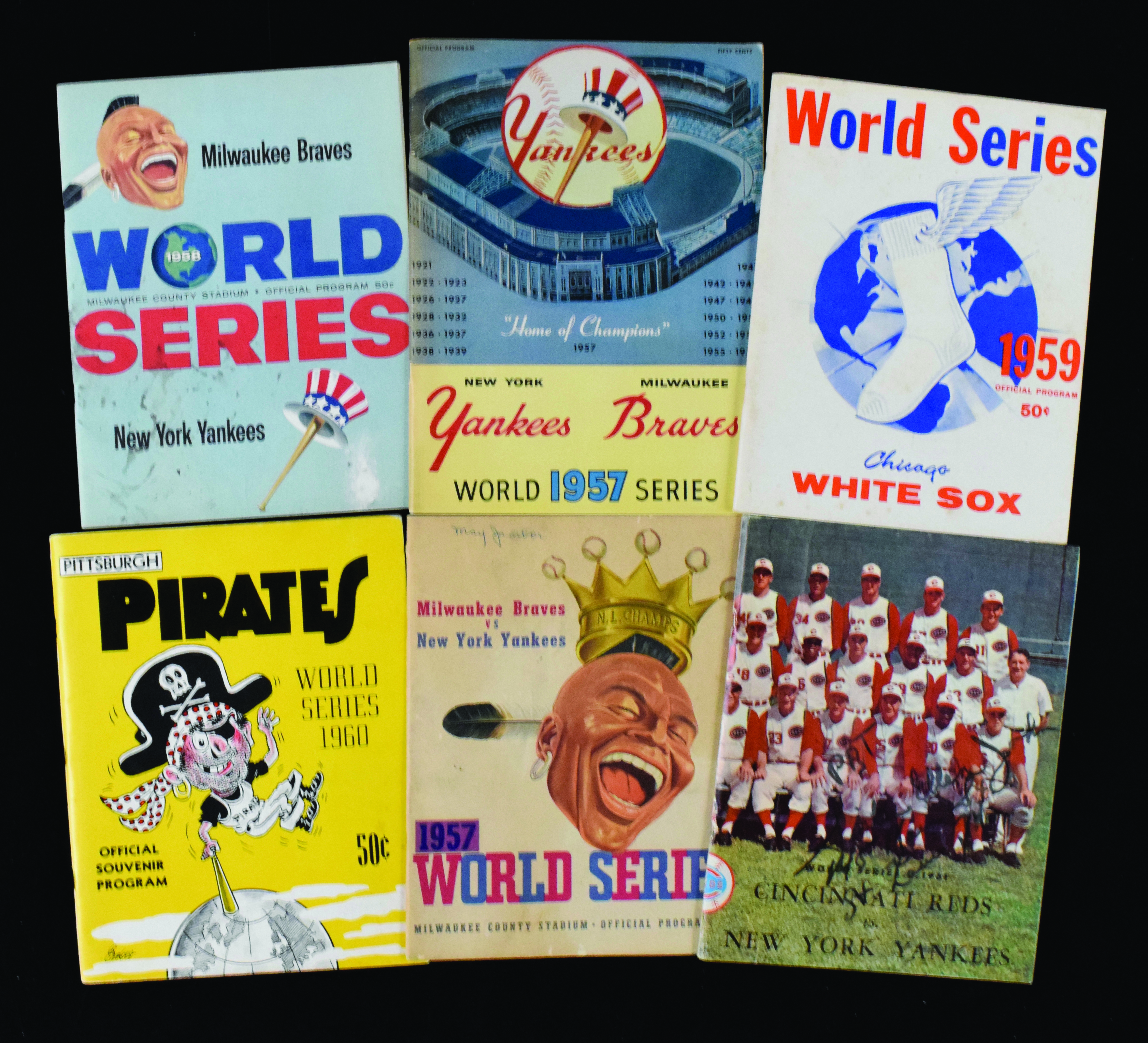 Description:Lot of (7) World Series programs from 1957-1962 (FR/GD-EX/MT). Includes 1957 program from game played at Yankee Stadium (EX/MT unscored), 1957 program from game played at Milwaukee County Stadium (VG unscored - name written on cover), 1958 prpgram from game played at Milwaukee County Stadium (GD-G/VG unscored), 1959 program from game played at Comiskey Park (VG-VG/EX unscored), 1960 program from game played at Forbes Field (EX-EX/MT unscored), 1961 program from game played at Crosley Field (VG unscored - writing on cover), and 1962 program from game played at Yankee Stadium (FR/GD detached cover - unscored).