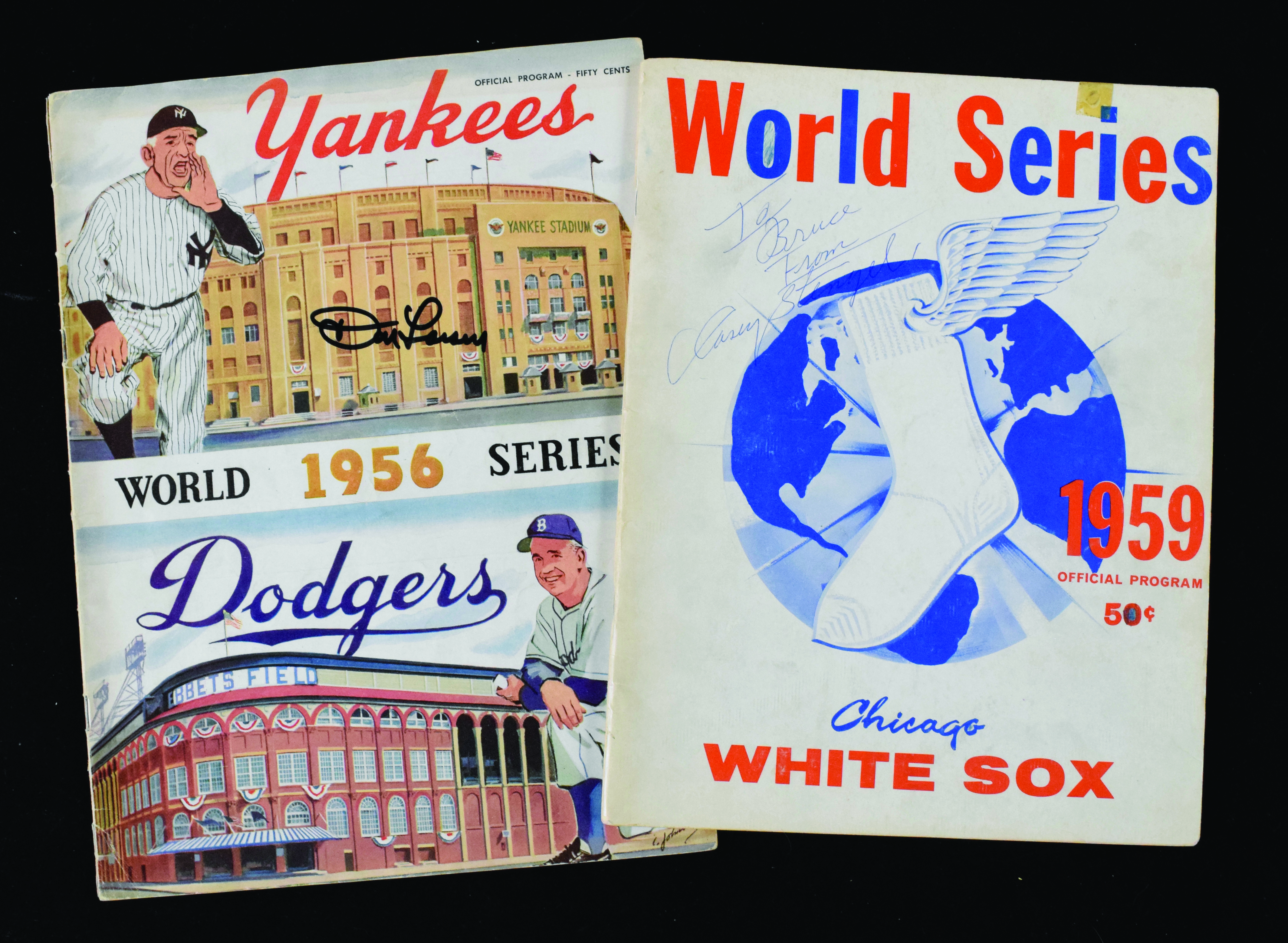 Description:Casey Stengel and Don Larsen signed World Series programs (VG-VG/EX). Includes 1956 program signed by Don Larsen in black marker rating 9/10 out of 10 (VG unscored), and 1959 program signed by Casey Stengel in blue ink rating 8/9 out of 10 (personalized to Bruce - VG/EX unscored, minor tape at top edge).