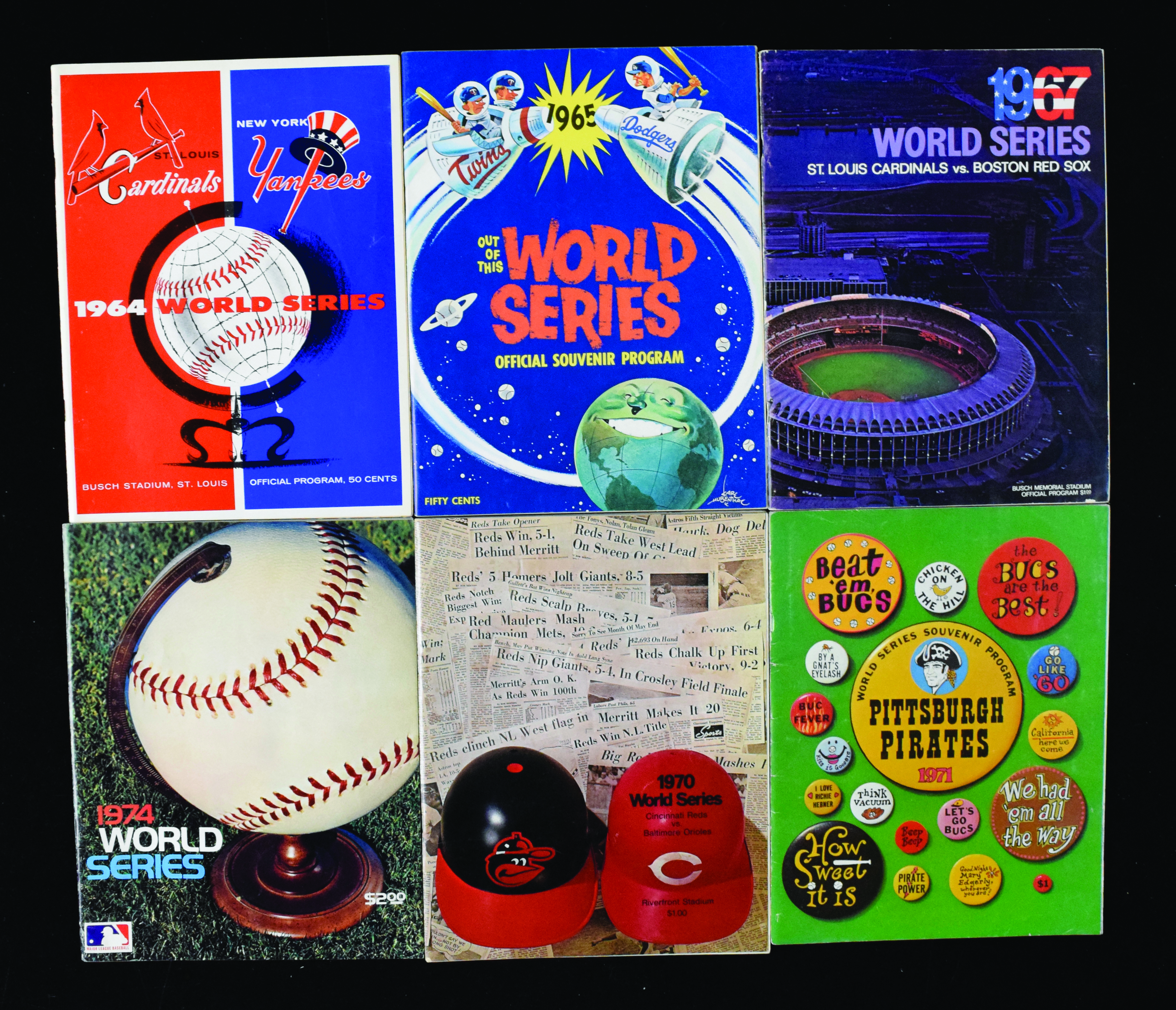 Description:Lot of (20) World Series programs from 1963-1979 (GD-NM). Includes 1963 at Dodger Stadium, 1964 at Busch Stadium, 1965 at Dodger Stadium, 1966 at Memorial Stadium, 1967 at Busch Stadium, 1968 at Tiger Stadium, 1969 at Memorial Stadium, 1970 at Riverfront Stadium, (2) 1971 at Three Rivers Stadium with NLCS Game 3 ticket stub (VG) and World Series Game 4 ticket stub (G/VG), 1972 at Riverfront Stadium, 1973 at Shea Stadium, 1974, (2) 1975, 1976, 1977, (2) 1978, and 1979. Most appear to average VG/EX-EX overall, but each has not been individually examined page by page. Range: GD-NM