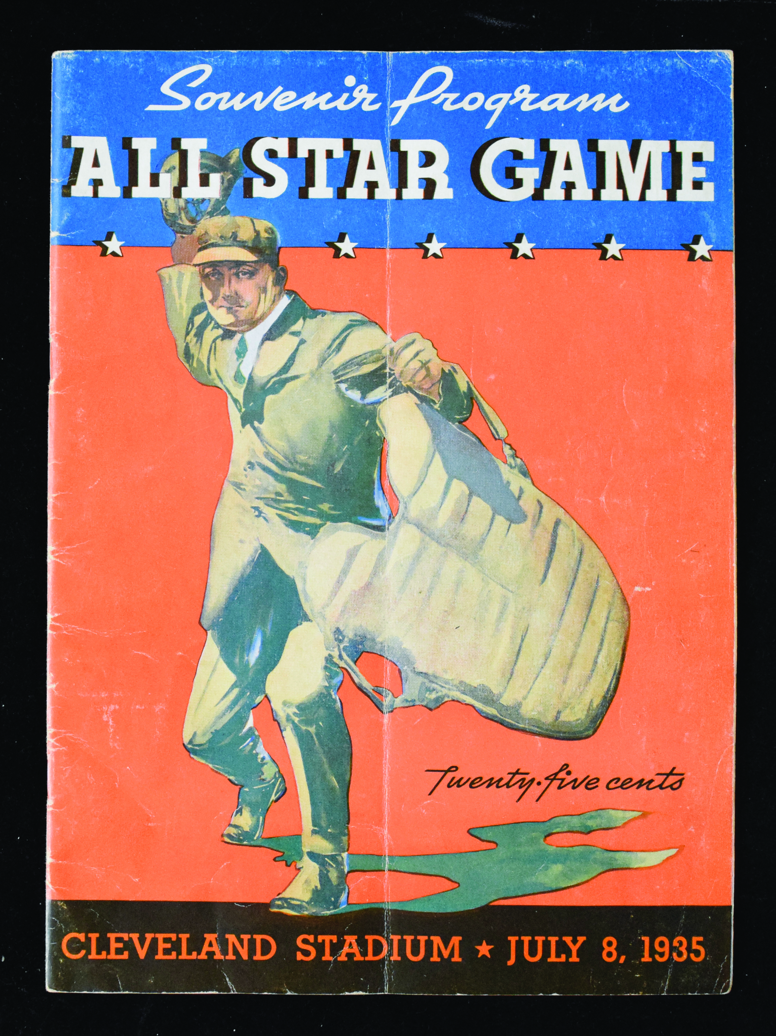 Description:1935 MLB All Star Game program (VG). Cleveland Stadium program from the 7/8/1935 All Star Game in which Lefty Gomez and the American League defeated the National League by a score of 4-1 with Jimmie Foxx homering for the AL. Scored in pencil, with fairly clean interior, but has normal age and handling wear including a vertical fold crease: VG