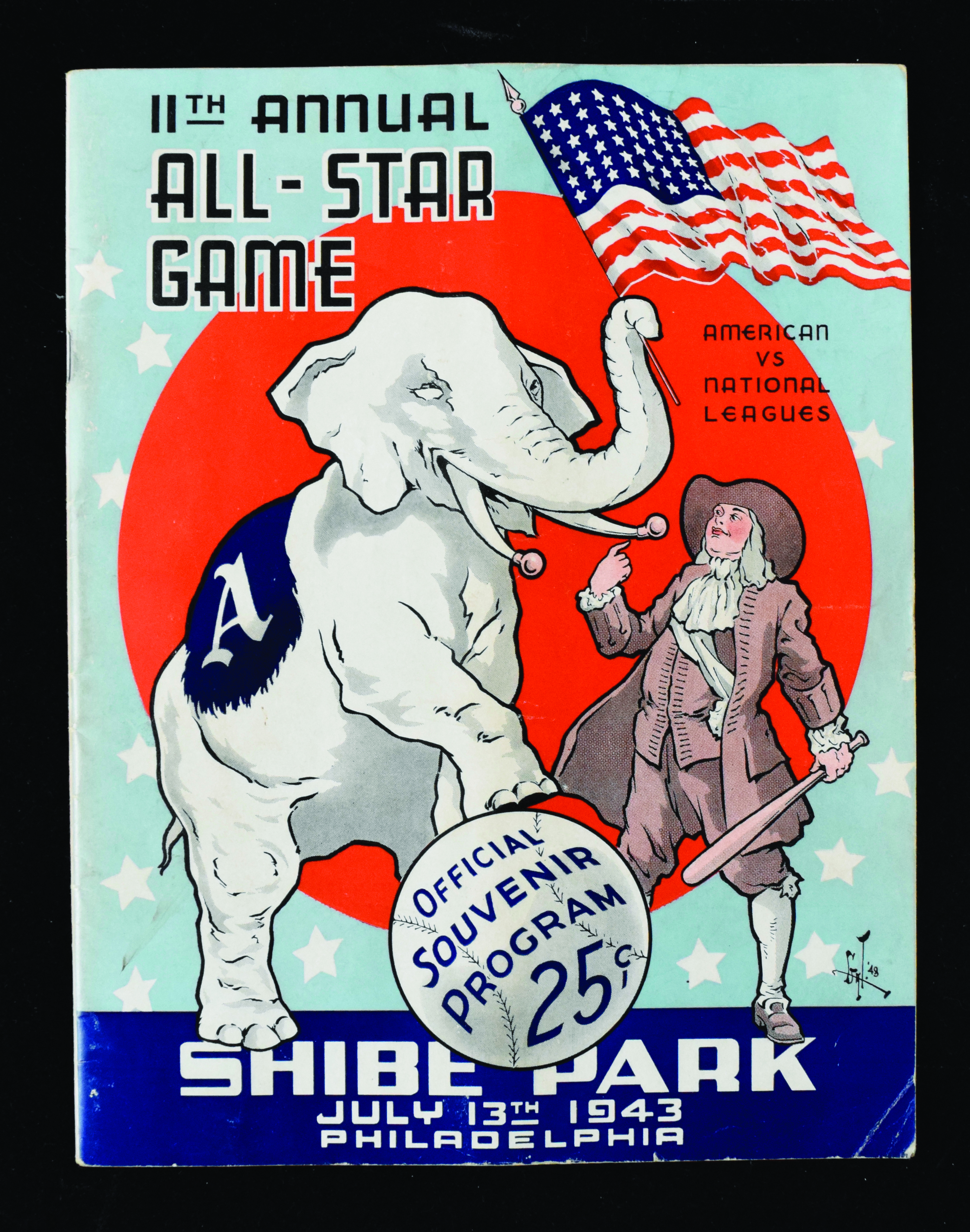 Description:1943 MLB All-Star Game program (EX). Shibe Park program from the 7/13/1943 All-Star Game in which the American League defeated the National League by a score of 5-3 with Bobby Doerr homering for the AL. Unscored with clean interior, but light wear at the bottom right corner, and very minor vertical fold crease: EX