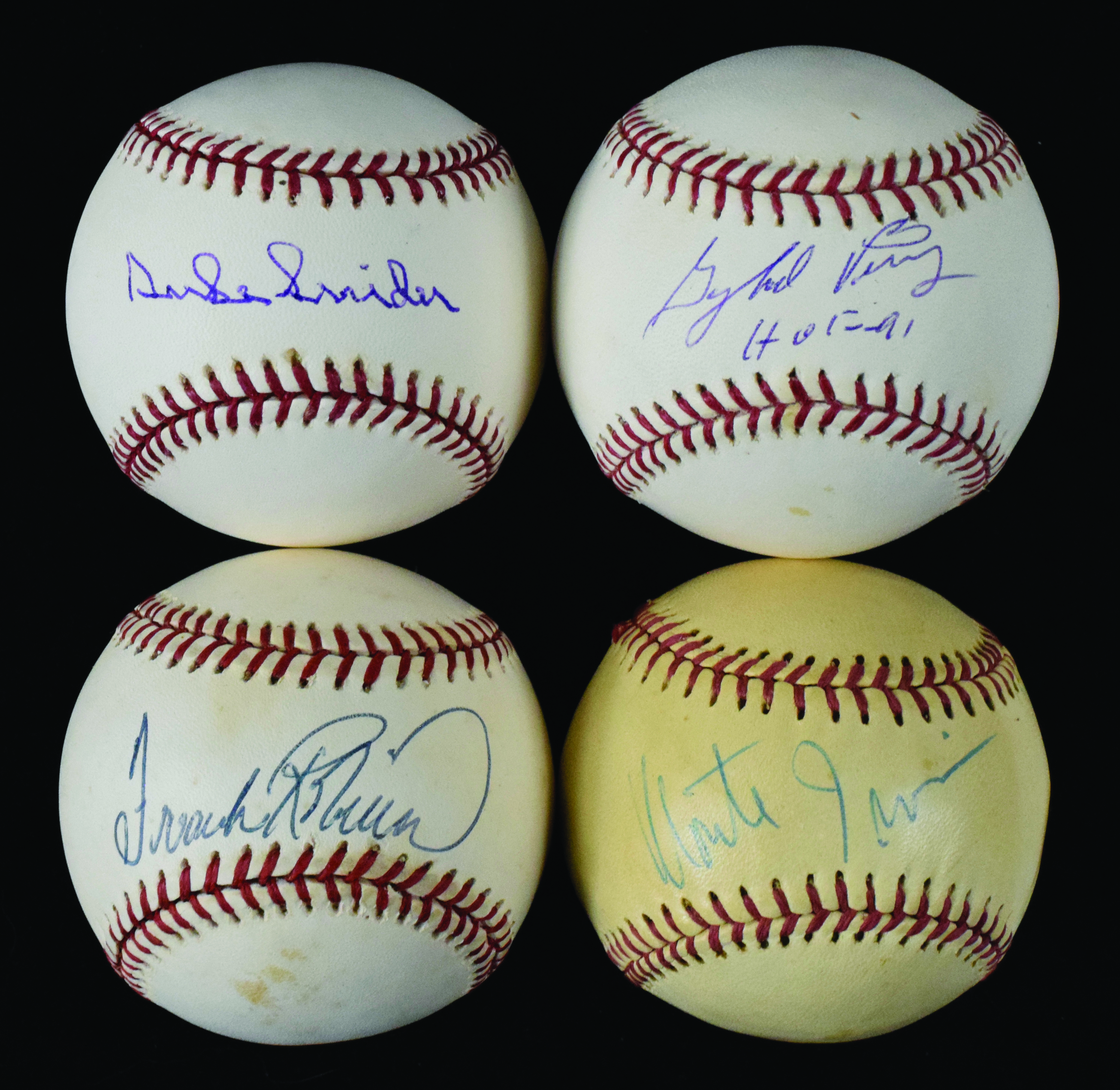 Description:Duke Snider, Monte Irvin, Gaylord Perry, Frank Robinson signed baseballs (EX-NM). Includes B.Selig ML ball signed by Duke Snider (PSA/DNA), B.Selig ML ball (light toning) signed by Gaylord Perry with "HOF 91" inscription (Tri-Star and MLB Authenticated), Wilson Little League ball (toning) signed by Monte Irvin, and B.Brown AL ball (light toning) signed by Frank Robinson (JSA). Signatures rate 8 to 9/10 out of 10: EX-NM 2100000409273, 2100000409310, 2100000409341, 2100000409358