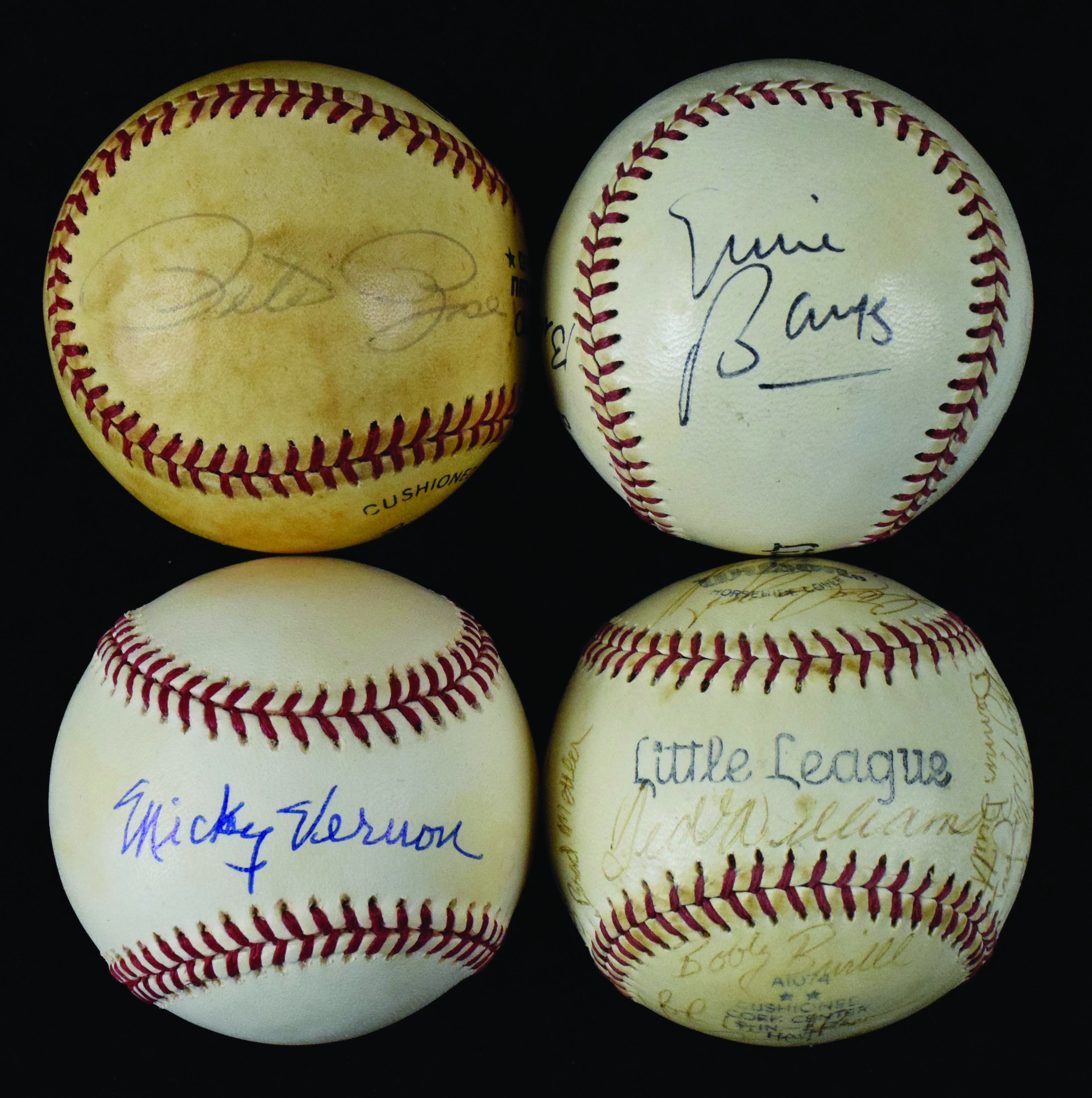 Description:Lot of (9) single and multi-signed baseballs (VG-NM/MT). Includes C.Feeney NL ball (toned) signed by Pete Rose (JSA); G.Budig AL ball (toning) signed by Mickey Vernon (JSA); B.Selig ML ball signed by LaMarr Hoyt with "83 AL Cy Young" "85 All Star MVP" inscriptions (Tri-Star and MLB Authenticated); B.Selig ML ball signed by Jeff Burroughs with "74 AL MVP" inscription (Tri-Star and MLB Authenticated); B.Selig ML ball signed by John Montefusco with "The Count" "1975 NL ROY" inscriptions (Tri-Star and MLB Authenticated); Wilson Little League ball (light toning) dual-signed by Billy Herman and Ernie Banks; Wilson Little League ball (toning) signed by Ted Williams and (28) early-mid 1980s minor leaguers; Wilson Little League ball (toning) signed by (12) members of the 1984 Montreal Expos: Tim Raines, Pete Rose, Terry Francona, Jeff Reardon, Sal Butera, Bryan Little, Bryn Smith, Galen Cisco, and others; B.Giamatti NL ball (light toning) signed by (14) members of the 1989 Pittsburgh Pirates: Barry Bonds, Andy Van Slyke, Jim Gott, Mike LaValliere, Ken Oberkfell, John Cangelosi, Gary Redus, Jay Bell, R.J. Reynolds, Glenn Wilson, Sid Bream, and others. Signatures rate 5/6 to 9/10 (avg 8) out of 10: VG-NM/MT 2100000409266, 2100000409297, 2100000409303, 2100000409365, 2100000409372, 2100000409389, 2100000409396, 2100000409402, 2100000409419