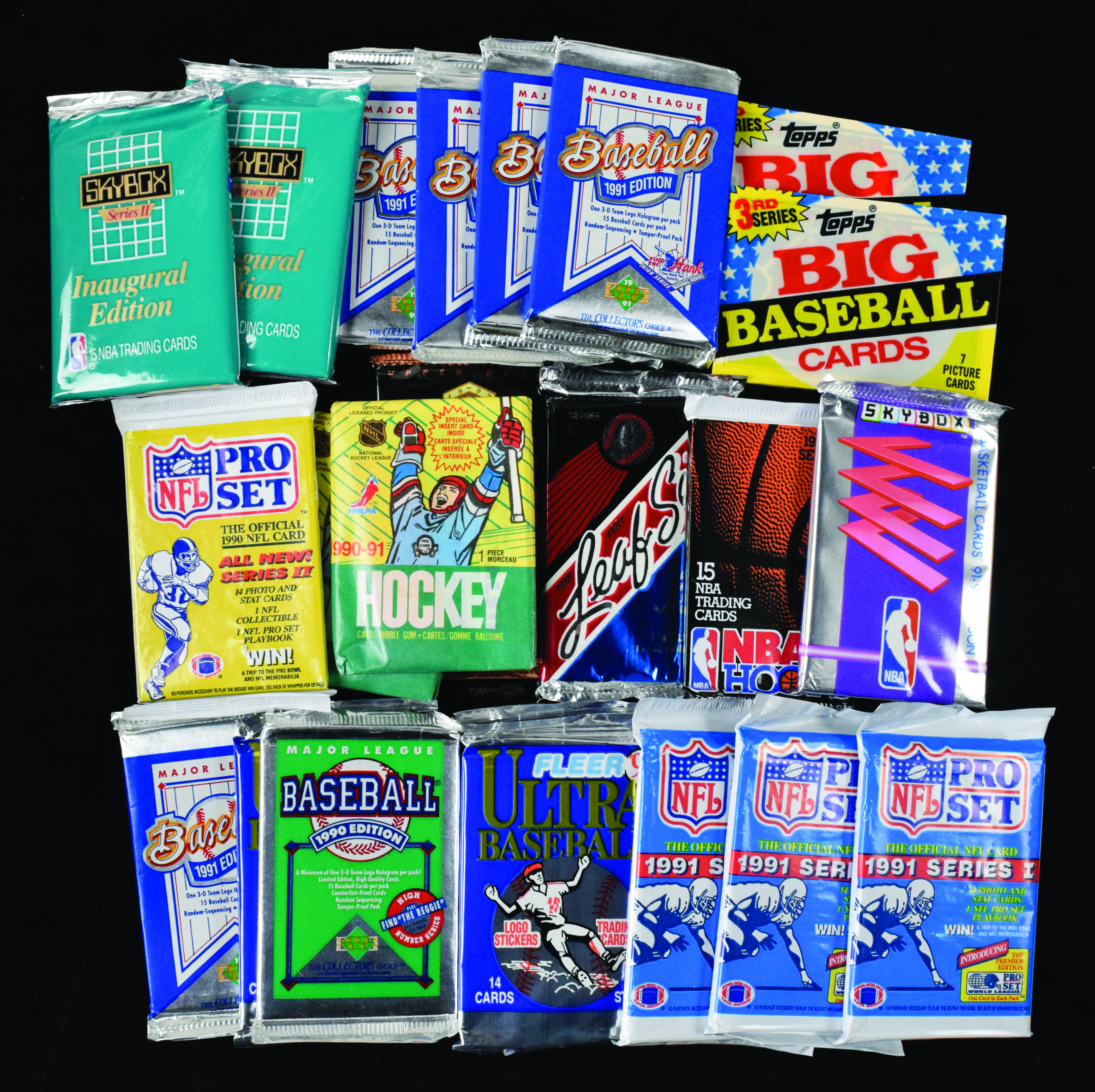 Description:Lot of (78) baseball, basketball, football, and hockey card packs from 1989-1993 (NM overall). Baseball wax/foil packs: (2) 1989 Topps Big series 3, 1989 Bowman, 1990 Upper Deck, (4) 1991 Fleer Ultra, (3) 1991 Leaf series 2, (9) 1991 Upper Deck, and (24) 1993 Upper Deck series 1, plus 1991 Fleer rack pack. Basketball wax packs: (2) 1990-91 SkyBox series 2, 1991-92 NBA Hoops series 1, and 1991-92 SkyBox series 1. Football wax packs: (2) 1990 Pro Set series 2, (6) 1991 Pro Set series 1, and 1991 Score series 1, plus (5) 1992 Topps series 1 jumbo packs, (3) 1992 Topps Stadium Club series 1 jumbo packs, and (5) 1992 Fleer Ultra jumbo packs. Hockey wax packs: (2) 1990-91 O-Pee-Chee, 1991-92 Pro Set series 2, 1991-92 Score French, and (3) 1993-94 Topps Premier series 1: NM overall