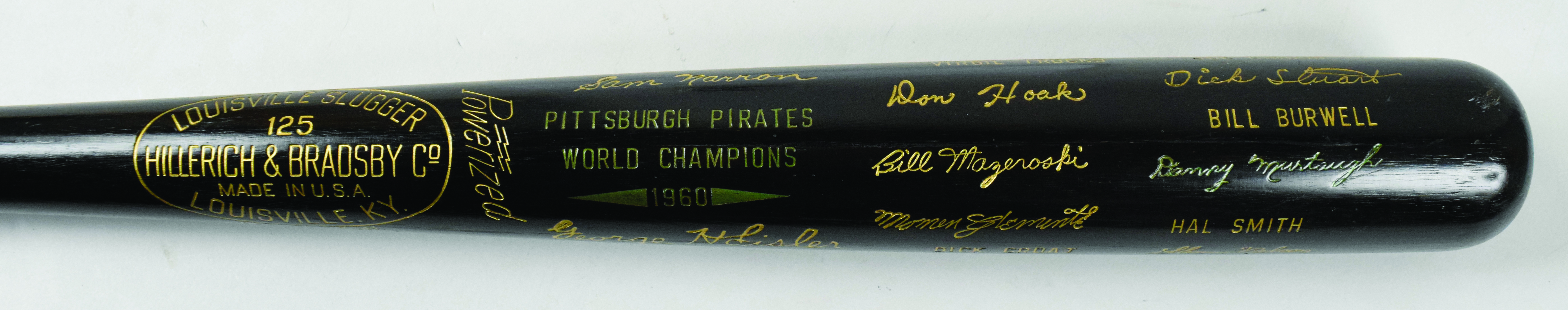 Description:Pittsburgh Pirates 1960 World Series Champions commemorative black bat (EX/MT-NM). 35" Louisville Slugger commemorative bat issued in honor of the 1960 World Series victory with impressed player names and facsimile signatures of team members including Clemente, Mazeroski, Groat, etc. Only very minor wear: EX/MT-NM