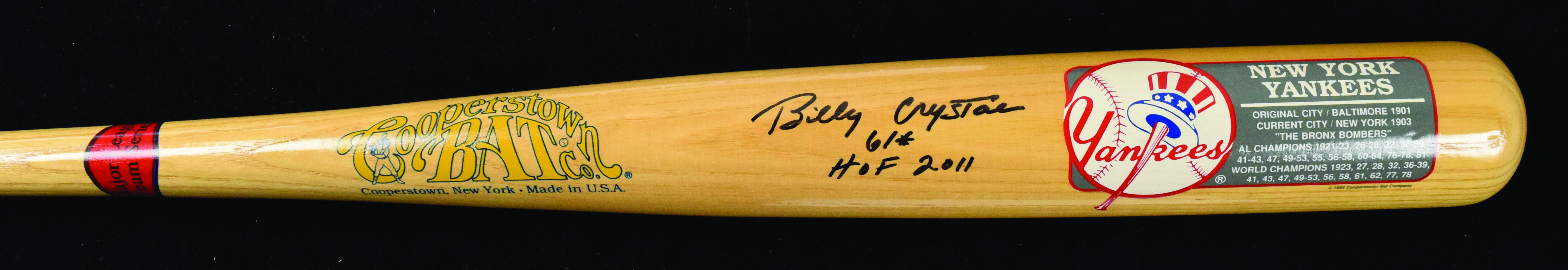Description:Billy Crystal signed and inscribed baseball bat - Ted Williams Museum COA (NM). 34" Cooperstown Bat Co. New York Yankees commemorative bat signed by Crystal in black marker with "61*" "HOF 2011" inscriptions. Signature rates 8 out of 10. Includes COA from the Ted Williams Museum & Hitters Hall Of Fame stating that the bat was signed there and then on display: NM