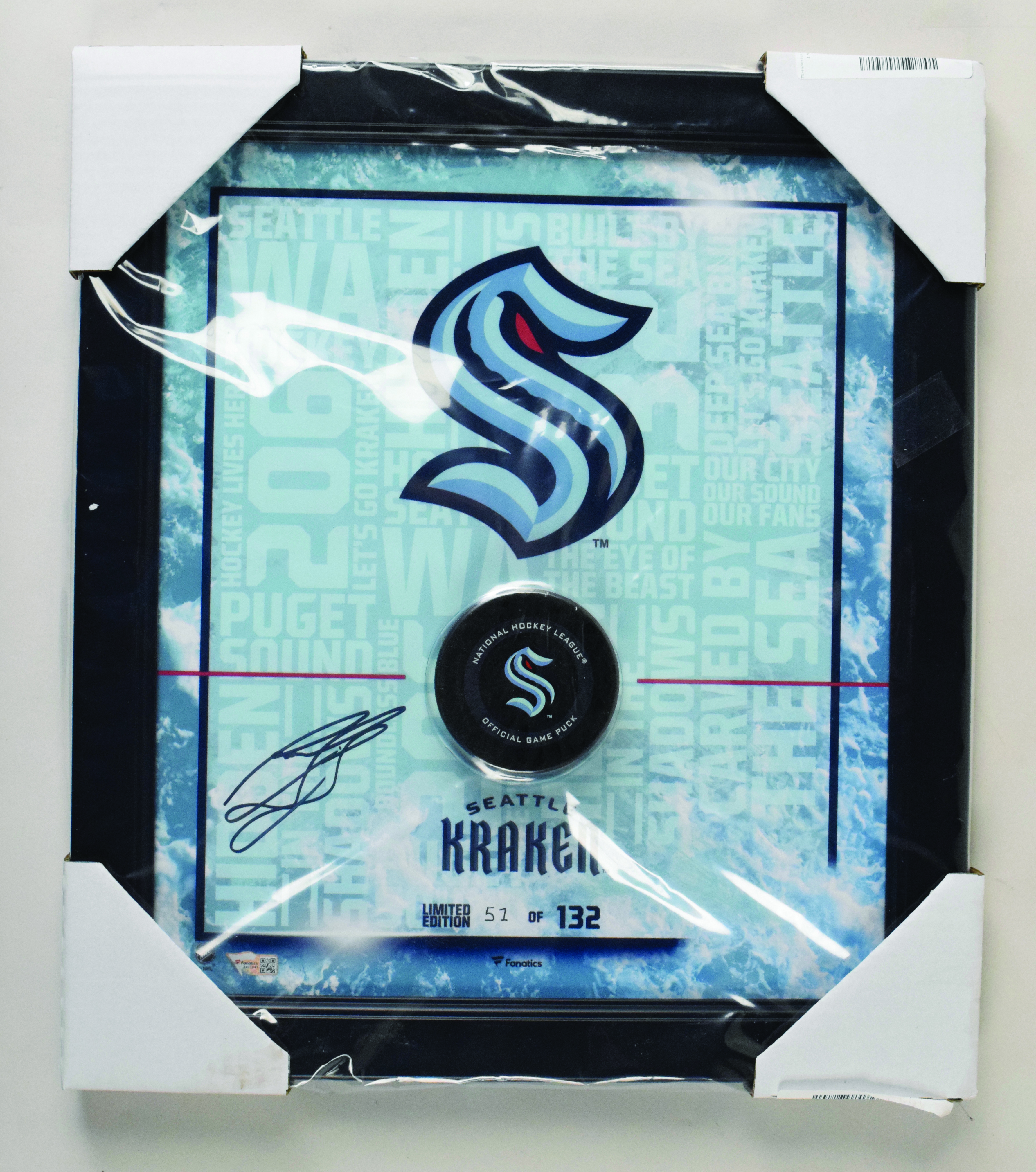 Description:Ron Francis signed limited edition Seattle Kraken framed display - Fanatics (NM). Approx. 15"x17" framed display with protruding Kraken logo hockey puck. Francis signed the piece in black marker. Signature rates 9/10 out of 10. Numbered 51/132. Fanatics serial #ed hologram sticker is affixed: NM