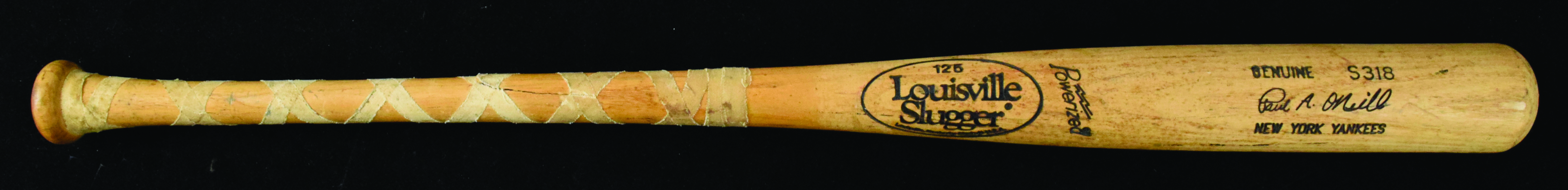 Description:Paul O'Neill professional model baseball bat, c.1993-97 (VG/EX). 34" Louisville Slugger S318 Paul O'Neill model bat with grip tape applied around the handle. Impressive use with barrel wear, rack marks, crack at the top of the handle, and moisture stain on the end of the bat: VG/EX ($400-$600)