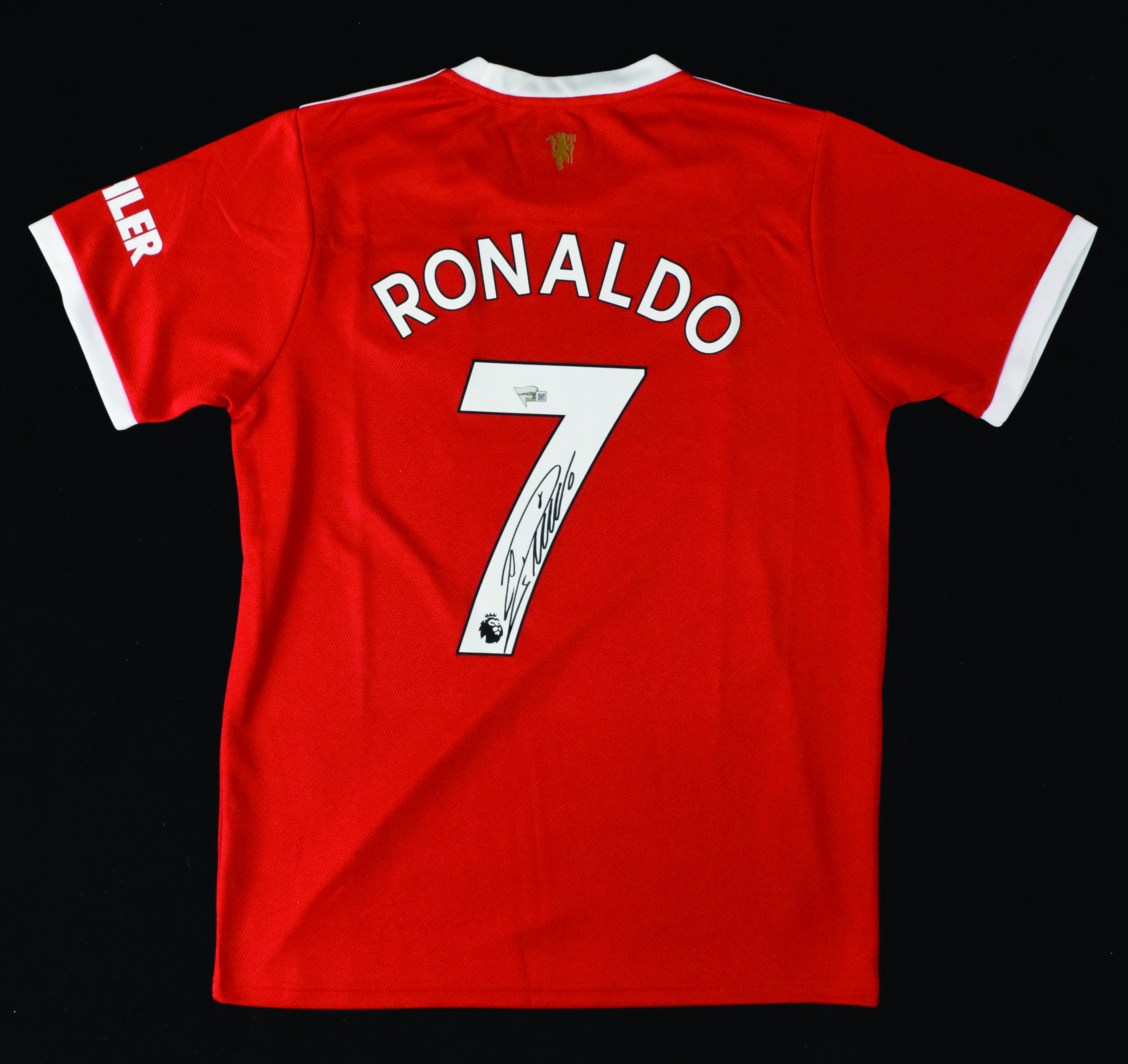 Description:Cristiano Ronaldo autographed Manchester United jersey with Fanatics authentication (Sig. NM/MT). Size XL Adidas Manchester United replica jersey has been signed on the back number by international superstar Cristiano Ronaldo, rating 9/10 out of 10. A Fanatics authentication sticker is affixed to the back number. Jersey has little to no mentionable wear: MT. ($500-$1,000)