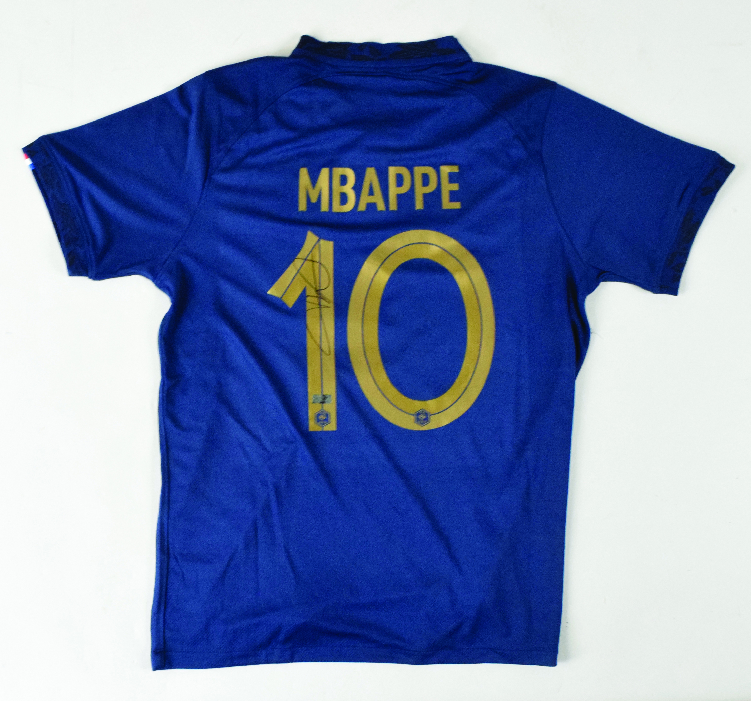 Description:Kylian Mbappe autographed France National Team jersey with Panini authentication (Sig. MT). Size L Nike France National Team replica jersey has been signed on the back number by international superstar Kylian Mbappe, rating 9 out of 10. A Panini authentication sticker is affixed to the back number, and Panini cert is also included. Jersey has little to no mentionable wear: MT. ($500-$1,000)