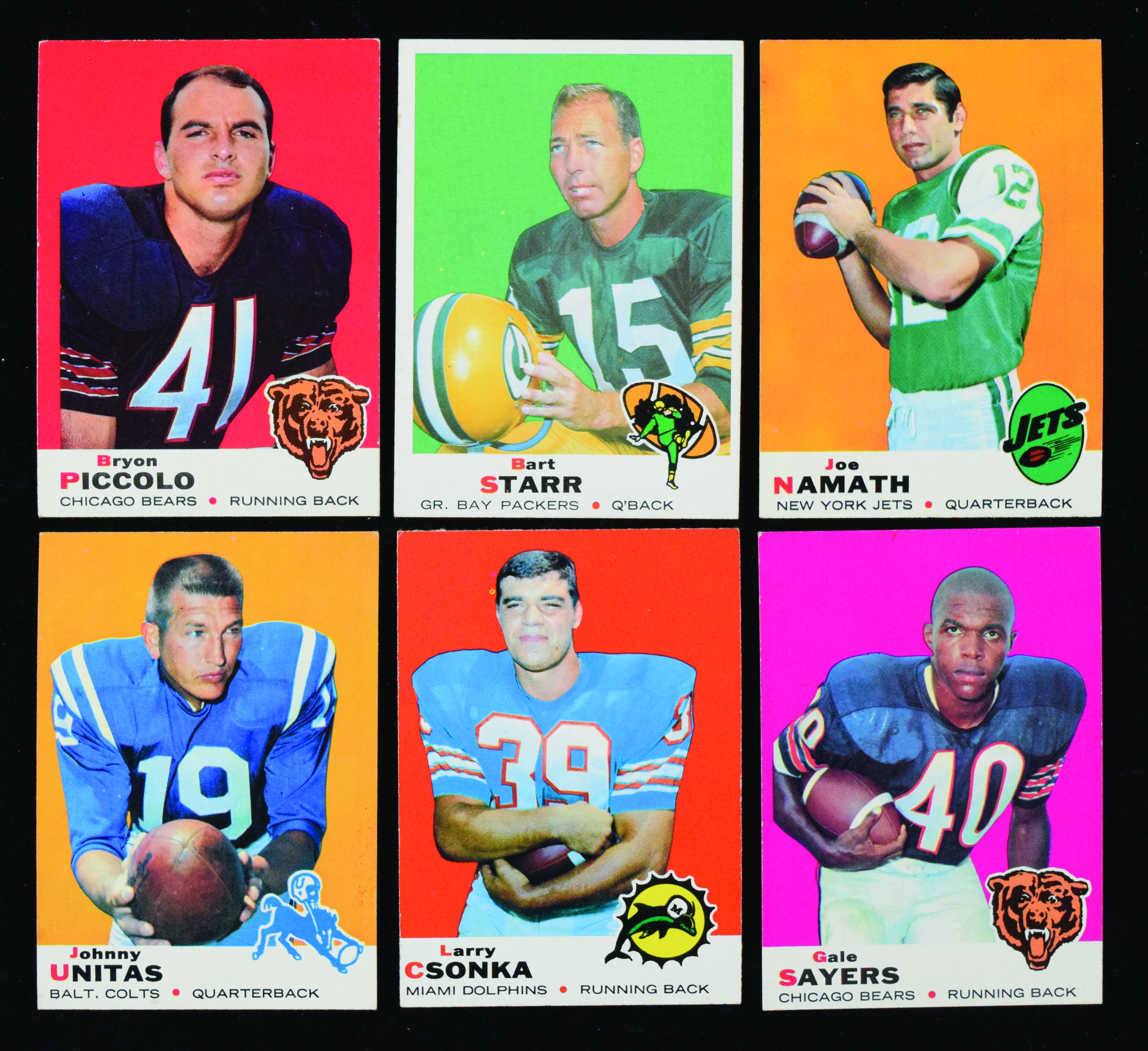 Description:1969 Topps Football complete set (VG-NM). Nice complete set of (263) different cards is highlighted by numerous Hall of Famers and rookie cards, including #s 26 Brian Piccolo RC (EX), 25 Johnny Unitas (EX), 51 Gale Sayers (EX OC, 75 Don Meredith (EX+), 100 Joe Namath (EX/MT), 120 Larry Csonka RC (EX/MT OC), 139 Dick Butkus (EX), 215 Bart Starr (EX/MT) and 232 George Blanda (EX/MT). Balance of the set, housed in pages and a binder, appears mostly EX-EX/MT. Range: VG-NM. ($500-$1,000)