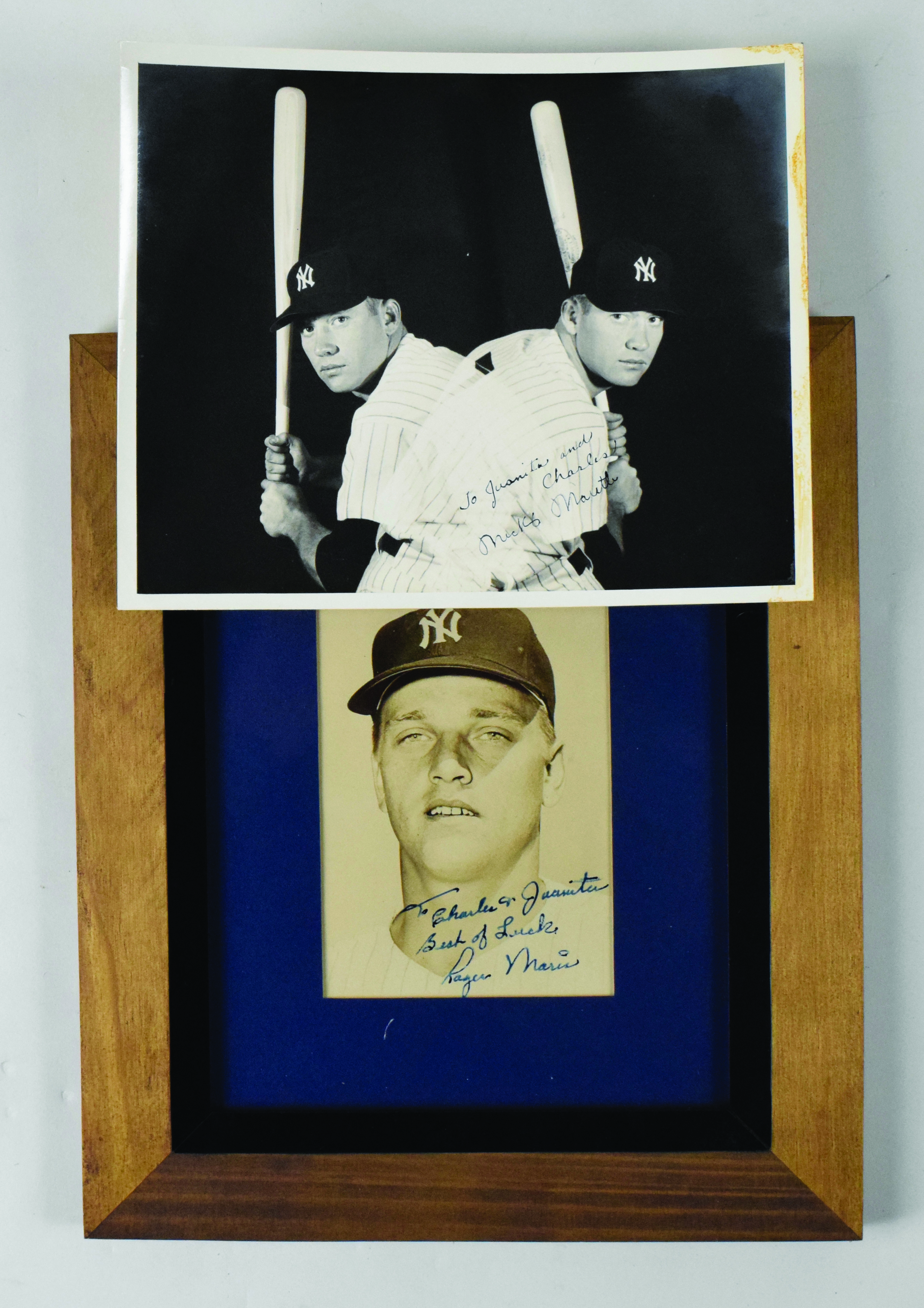 Description:Roger Maris autographed photograph with Mickey Mantle photo, c. 1960s (VG-EX/MT; Ruth family LOP). Includes 5"x7" portrait photo, which has been signed "To Charles + Juanita, Best of luck, Roger Maris" in fountain pen rating 7/8 out of 10. Photo, which has small tear at each upper corner, has been professionally and matted to 11 1/2"x 13 1/2". Also includes choice c. 1950s 8"x10" photo of Mickey Mantle, which has a secretarial autograph on the front. Light general wear with some mounting residue on right edge. Includes LOA from PSA/DNA and previous Hunt Auctions letter of provenance from the Ruth Family: VG-EX/MT. ($400-$600)