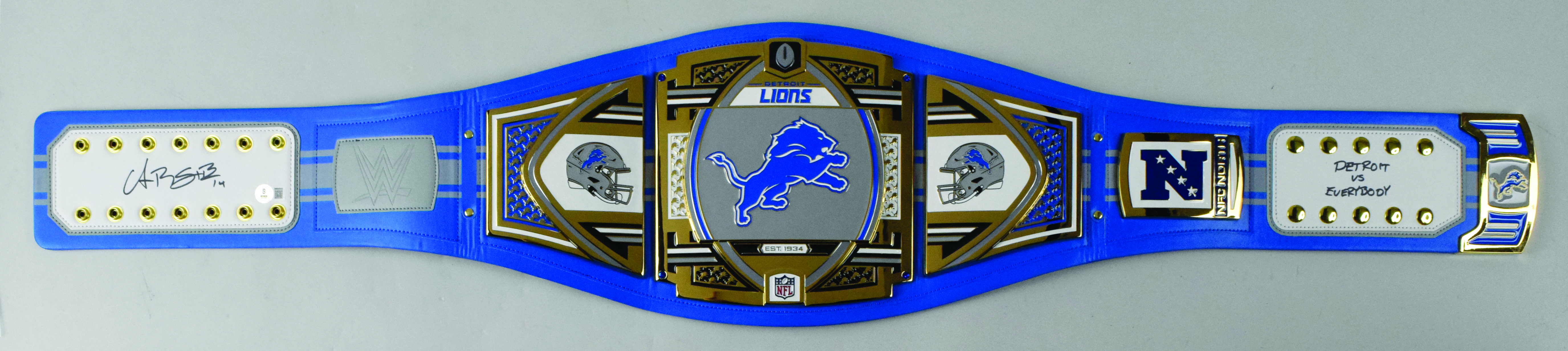 Description:Amon-Ra St. Brown signed & inscribed Detroit Lions WWE championship replica belt (WWE/Beckett auth.) Eye-catching, heavy duty WWE championship replica belt with Detroit Lions theme and logos as the centerpiece measures 51" end-to-end. Lions wide receiver Amon-Ra St. Brown signed the left panel in black marker with "14" inscription, and inscribed the right panel with "Detroit vs. Everybody." A Beckett Witnessed authentication sticker is on the left panel, and a WWE Authentic hologram and patch are on the reverse. Belt, which includes WWE zipper case with Lions logo on the reverse, is like new: NM/MT. ($500-$1,000)