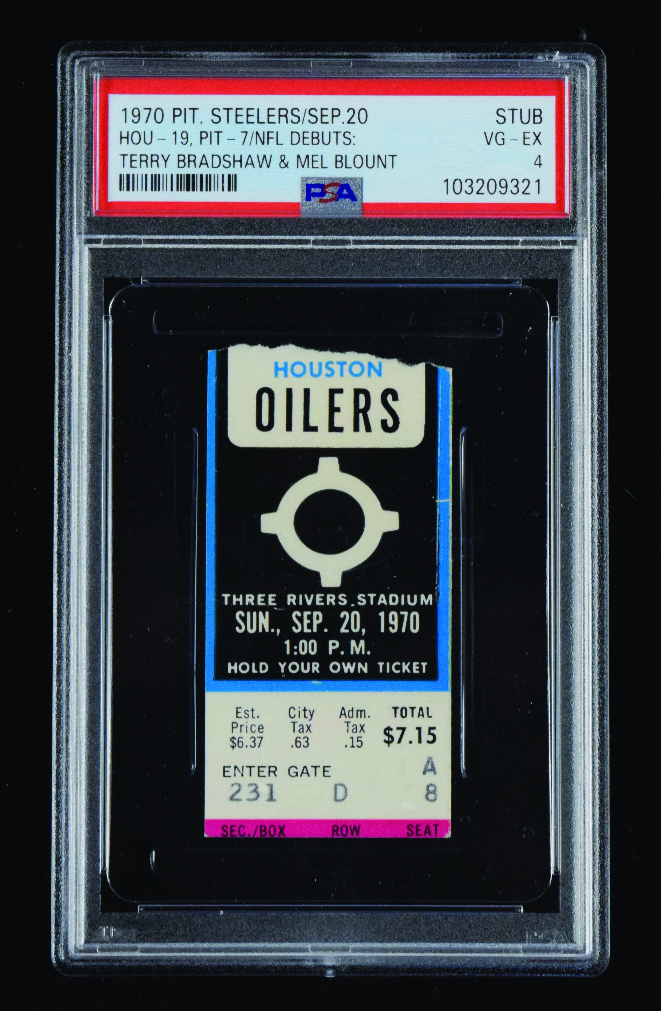 Description:1970 Terry Bradshaw & Mel Blount NFL debut ticket stub graded PSA 4 (VG/EX - Pop 3, none graded higher). 9/20/1970 Three Rivers Stadium ticket stub from game in which Bradshaw and Blount both made their NFL debuts. Authenticated and encapsulated by PSA with a grade of 4 (VG/EX), and their population report shows that only (6) ticket stubs have been graded, with this being one only three receiving the highest grade of 4: VG/EX ($1,000-$2,000)
