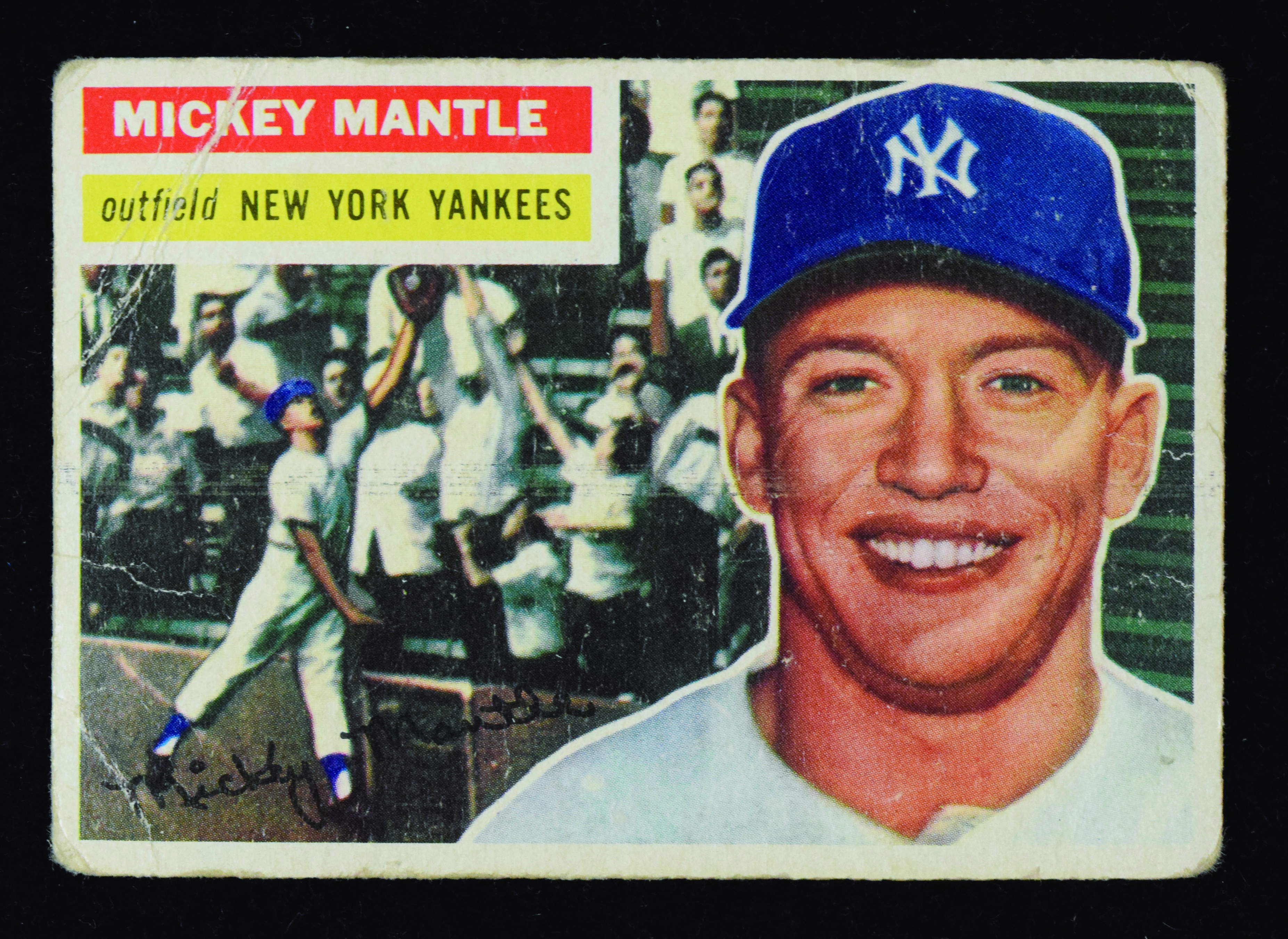 Description:1956 Topps #135 Mickey Mantle gray back (PR). Key card from the 1956 Topps set has a heavy crease in the upper left corner, as well as four rounded corners and other scattered creasing and wear. Gray back is relatively clean: PR. ($500-$750)