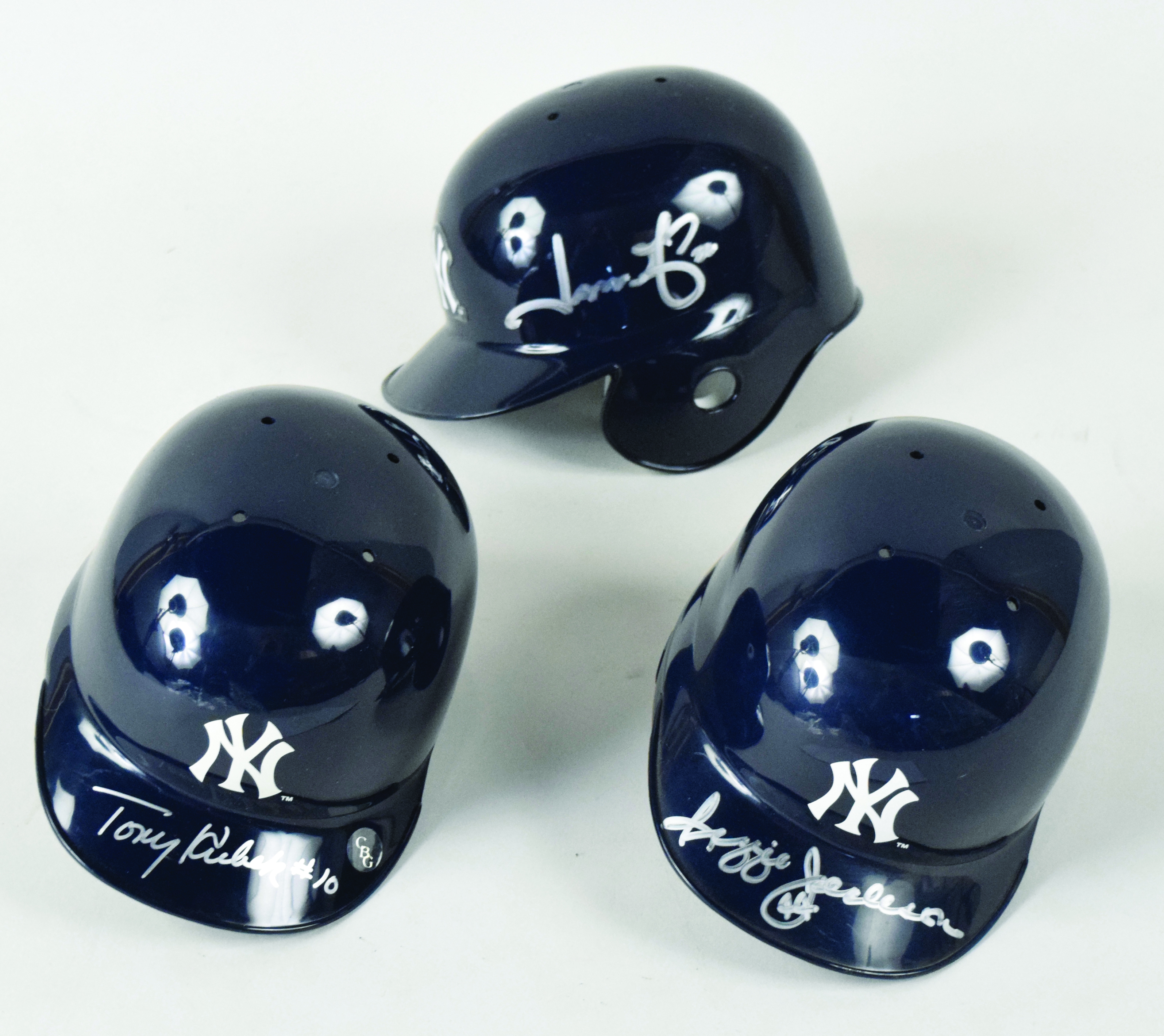 Description:Reggie Jackson, Tony Kubek, and Jason Giambi signed mini helmets (NM-NM/MT). All three New York Yankees mini helmets are signed in silver marker. Signatures rate 8 to 9 out of 10: NM-NM/MT
