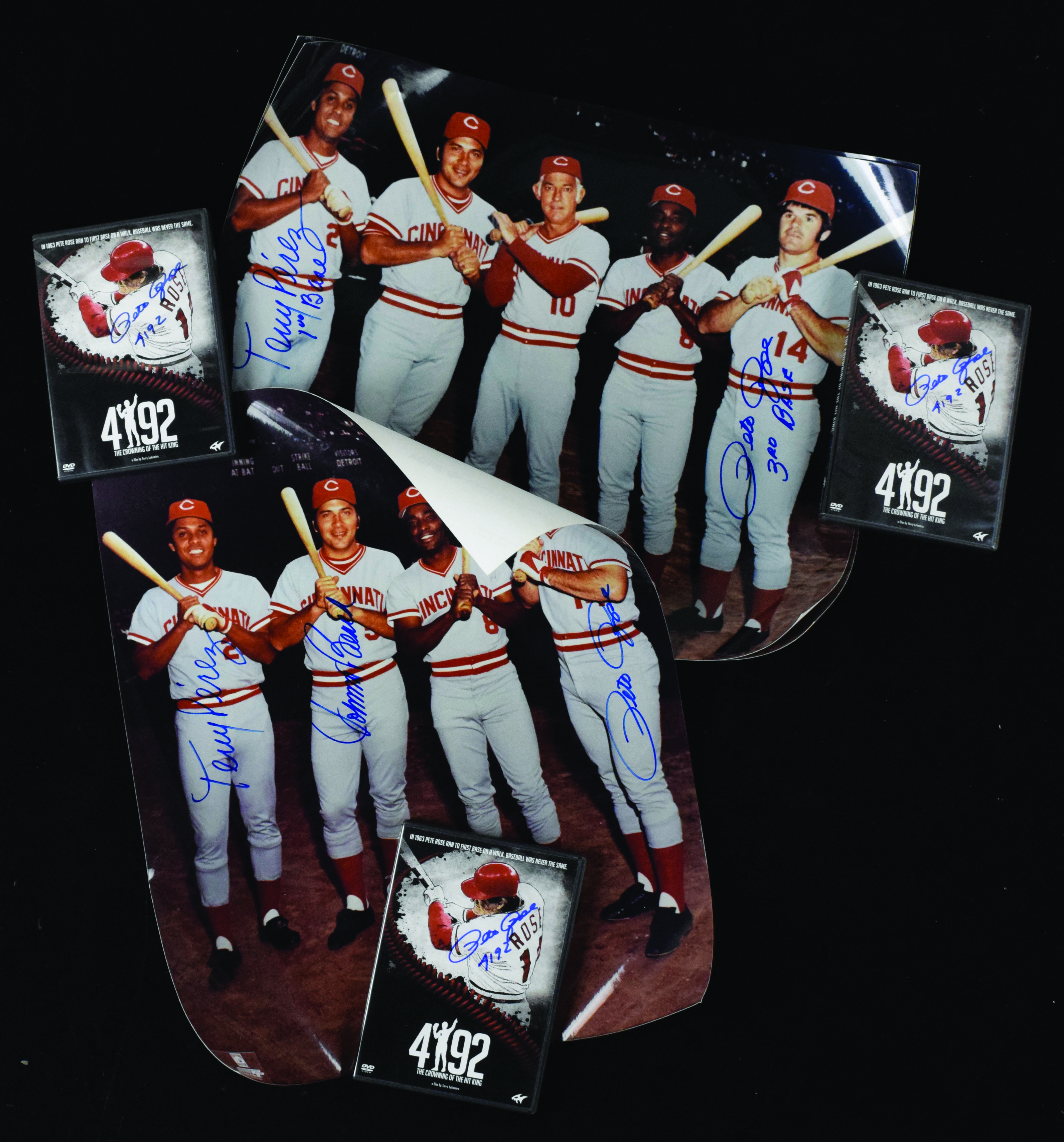 Description:Lot of (3) Cincinnati Reds signed 16"x20" photos and (3) Pete Rose signed DVDs (EX/MT-NM/MT). Includes (2) 16"x20" photos multi-signed by Johnny Bench, Tony Perez, and Pete Rose; 16"x20" photo dual-signed by Tony Perez with "1st Base" inscription and Pete Rose with "3rd Base" inscription; (3) 2010 "4192: The Crowning Of The Hit King" DVDs signed by Pete Rose with "4192" inscription added to each. Signatures rate 8 to 10 out of 10: EX/MT-NM/MT