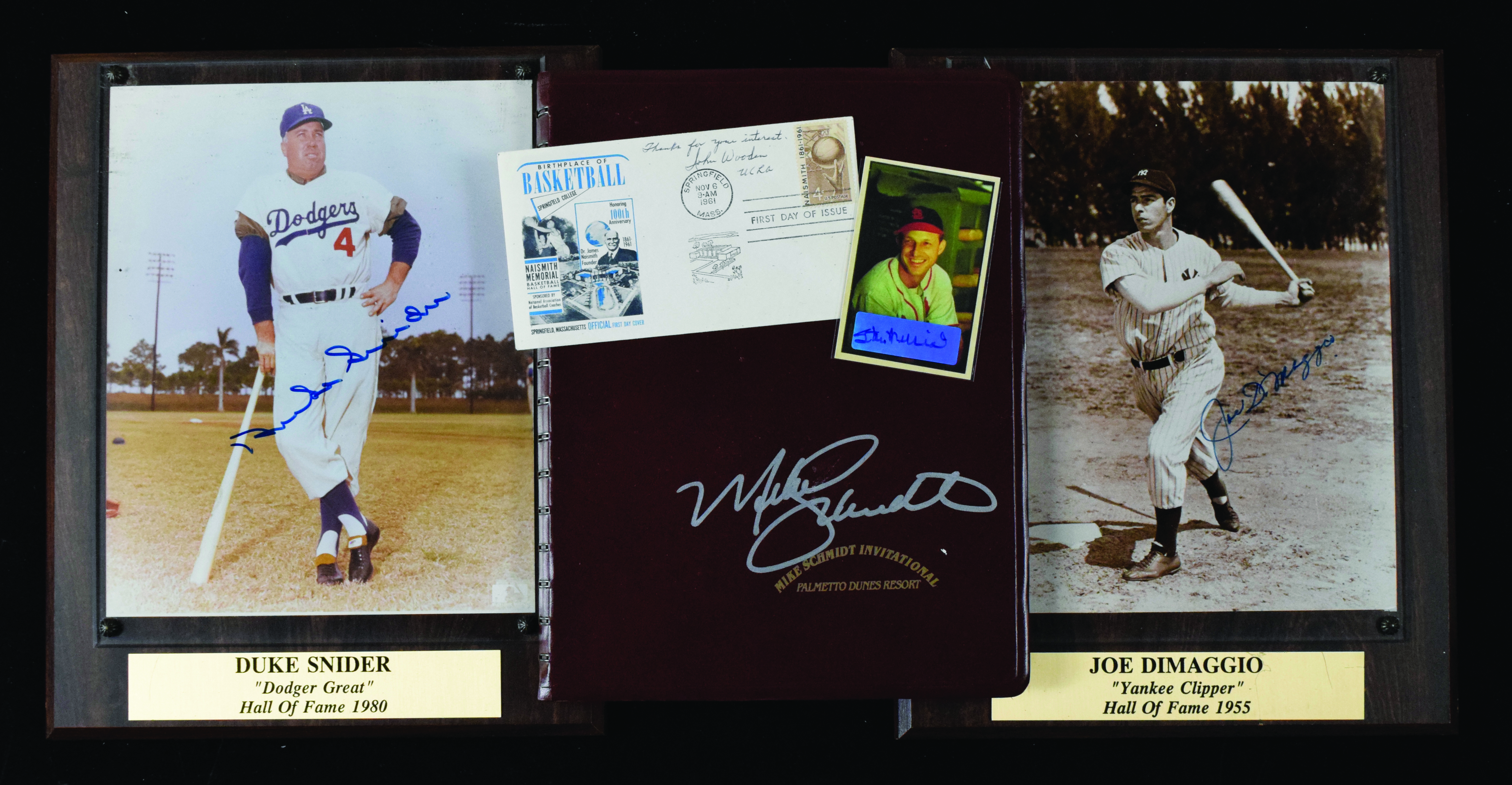 Description:Lot of assorted memorabilia and autographs including HOFers (GD-NM/MT). Autographs include 1961 FDC envelope signed by John Wooden with "UCLA" inscription; 1953 Bowman Color reprint card signed by Stan Musial (Stan The Man authenticated); (4) plaques containing signed 8"x10" photos: Joe DiMaggio (damaged plaque), Duke Snider, O.J. Simpson, and Lawrence Taylor; 1985 unused Mike Schmidt Invitational daily planner signed by Schmidt (PSA/DNA); American Baseball Cap size 7-3/8 Minnesota Twins batting helmet signed by Paul Molitor (ear pad worn off); Untagged #11 Phil Simms jersey signed by Simms (faded); and Arizona Diamondbacks mini helmet signed by Luis Gonzalez. Signatures rate 5/6 (Simms, Gonzalez) to 10 (avg 8) out of 10. Also includes 16"x18" c.1951-52 Carstairs "World Series Baseball Champions" banner (GD tears), (6) unused/unsigned L.Coleman NL baseballs, (21) New York Yankees 1999-2000 Beanie Buddies trading cards, (20) 9/30/2001 Cal Ripken Jr final game at Yankee Stadium commemorative tickets, and Atlanta Braves 2025 All-Star Game bobblehead: GD-NM/MT