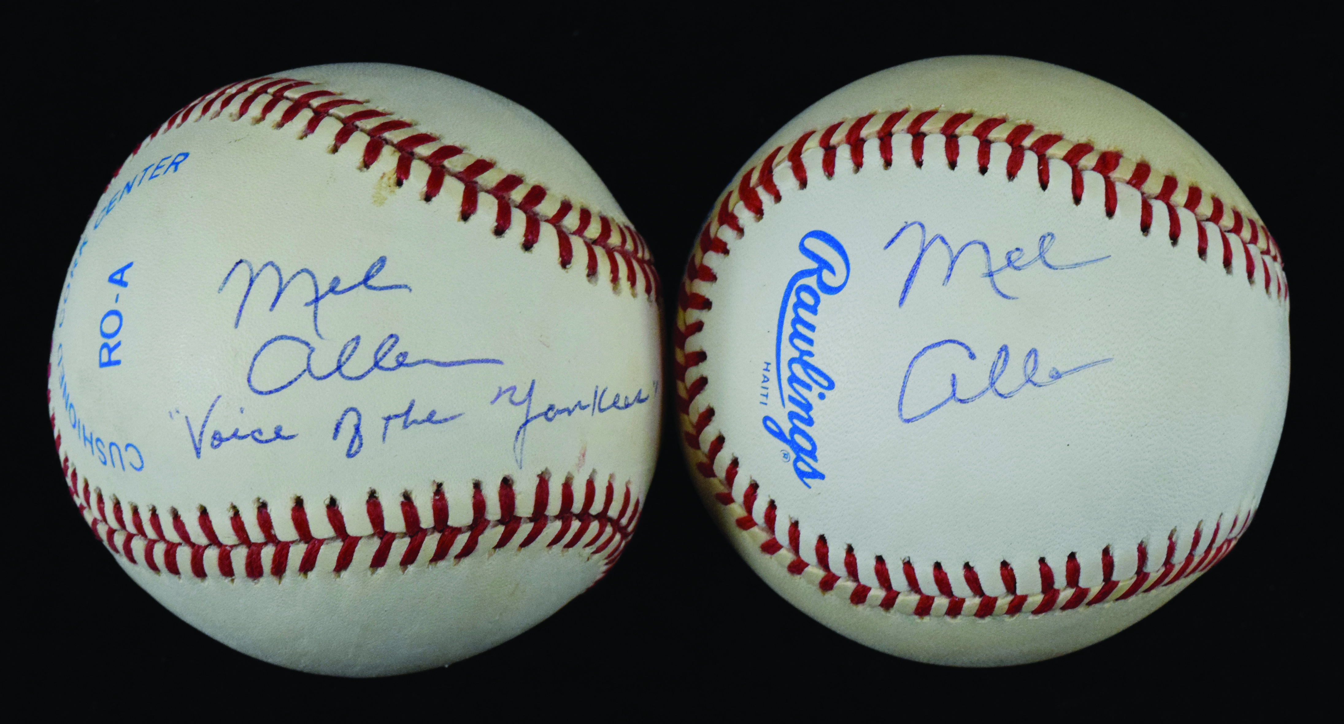 Description:Lot of (2) Mel Allen signed baseballs - JSA (see description). Both are B.Brown AL balls signed by Allen in blue ink with "Voice of the Yankees" inscription added to one. Signatures rate 8 to 9 out of 10. JSA serial #ed sticker is on both balls. Each ball has areas of white-out applied likely to cover toning.