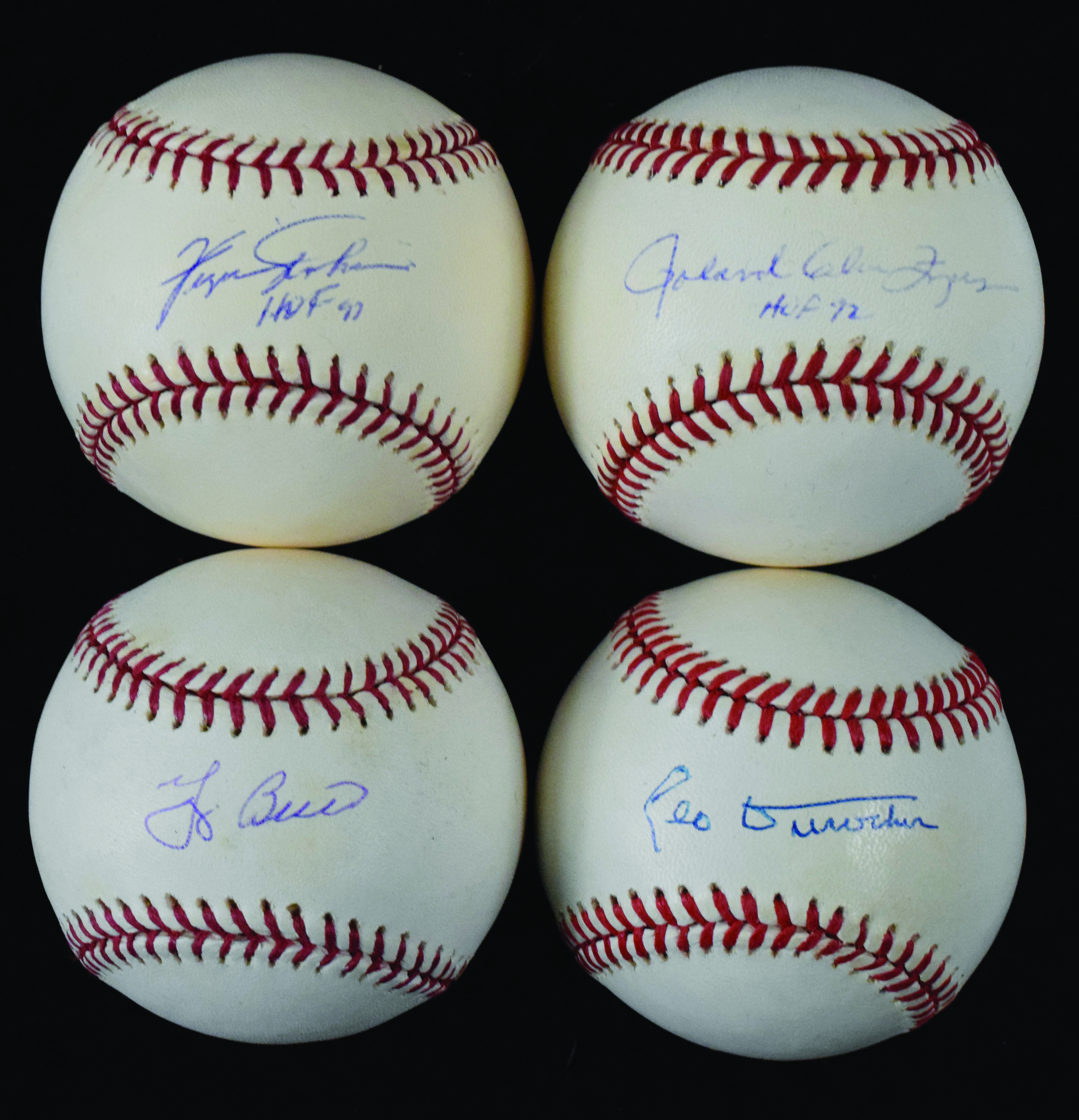 Description:Lot of (5) stars and HOFers signed baseballs (EX-NM). Includes B.Selig ML ball (toning) signed by Yogi Berra, B.Giamatti NL ball (toning) signed by Leo Durocher (JSA), B.Selig ML ball (light toning) full name signed by Roland Glen Fingers with "HOF 92" inscription (fading), B.Selig ML ball (light toning) signed by Fergie Jenkins with "HOF 91" inscrioption (Reggie Jackson authenticated), and R.Manfred ML ball signed by Denny McLain with "Pete, I can't recall, Did I bet on Baseball or the Mafia?" inscription. Signatures rate 5/6 (Fingers) to 8/9 (avg 7/8) out of 10: EX-NM
