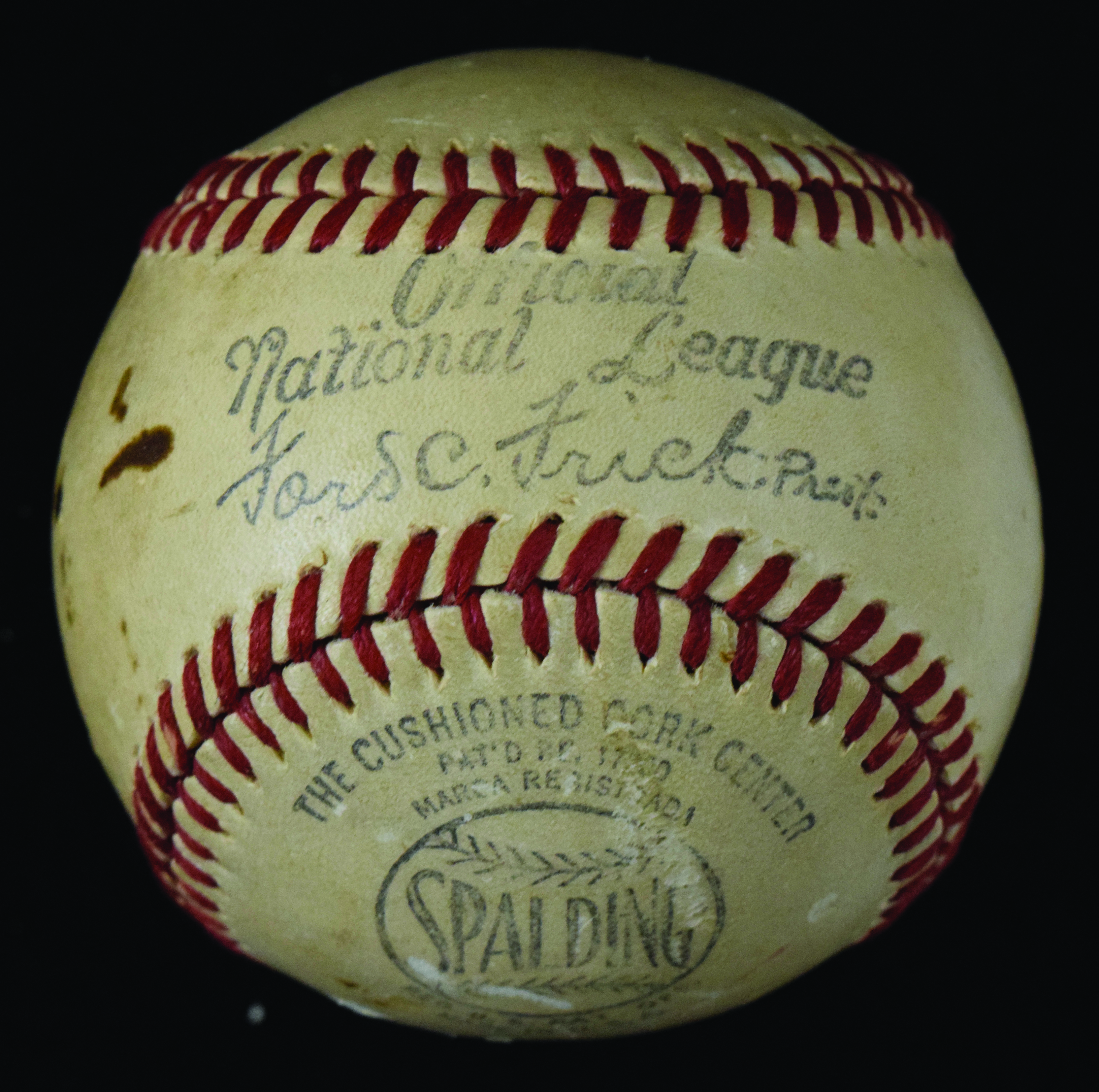 Description:Spalding official Ford Frick NL baseball, c.1941-42 (VG). National League ball with "PAT'D RE. 17200" below "The Cushioned Cork Center" text, and "Marca Registrada" above the Spalding logo. Scattered spots of surface wear and stains: VG